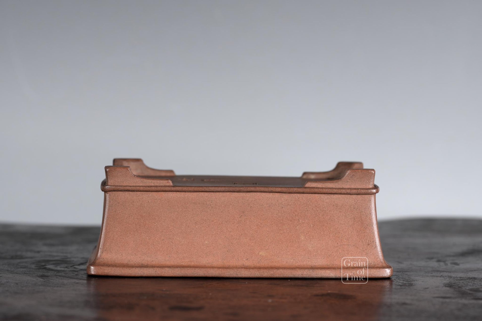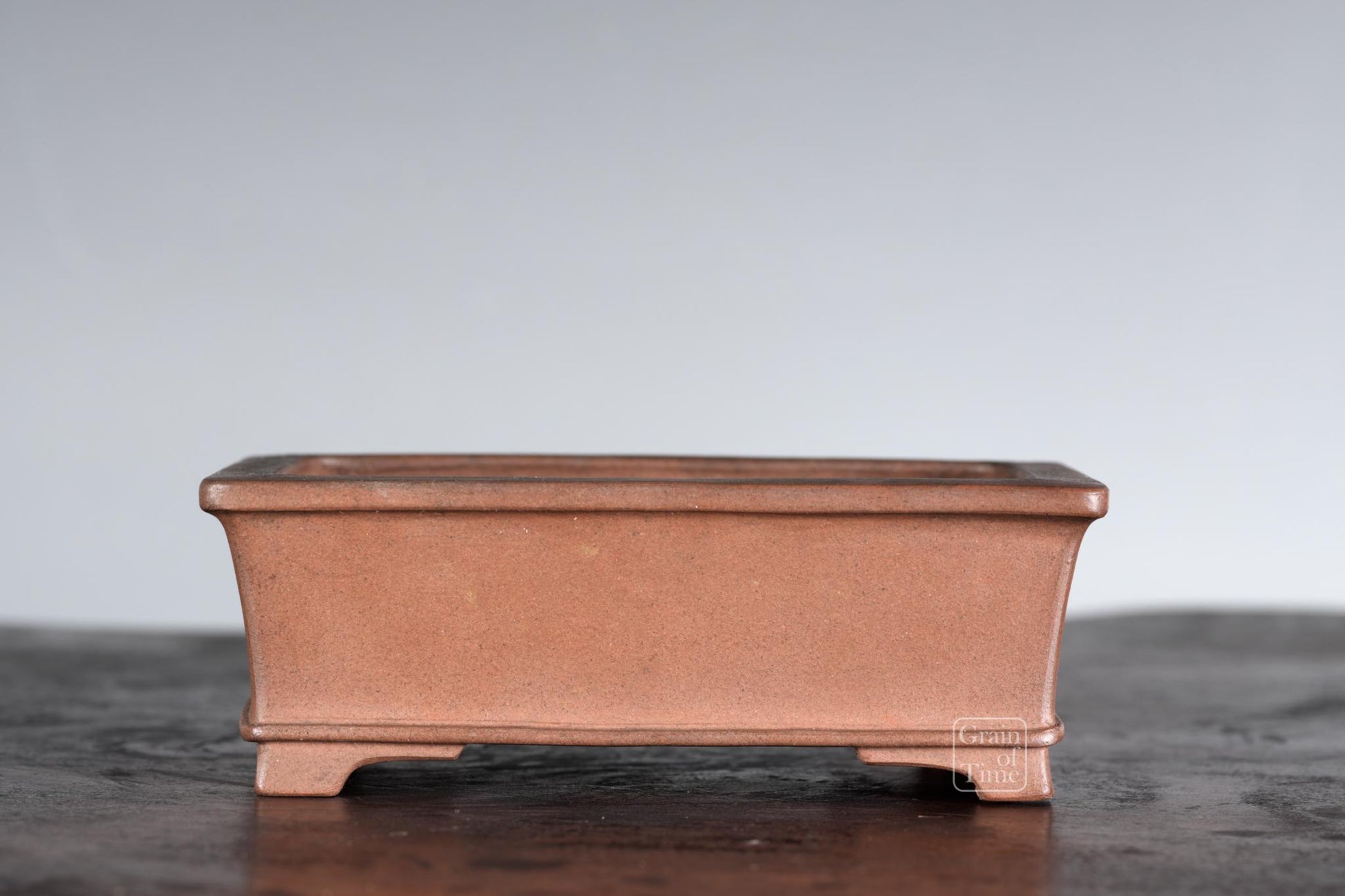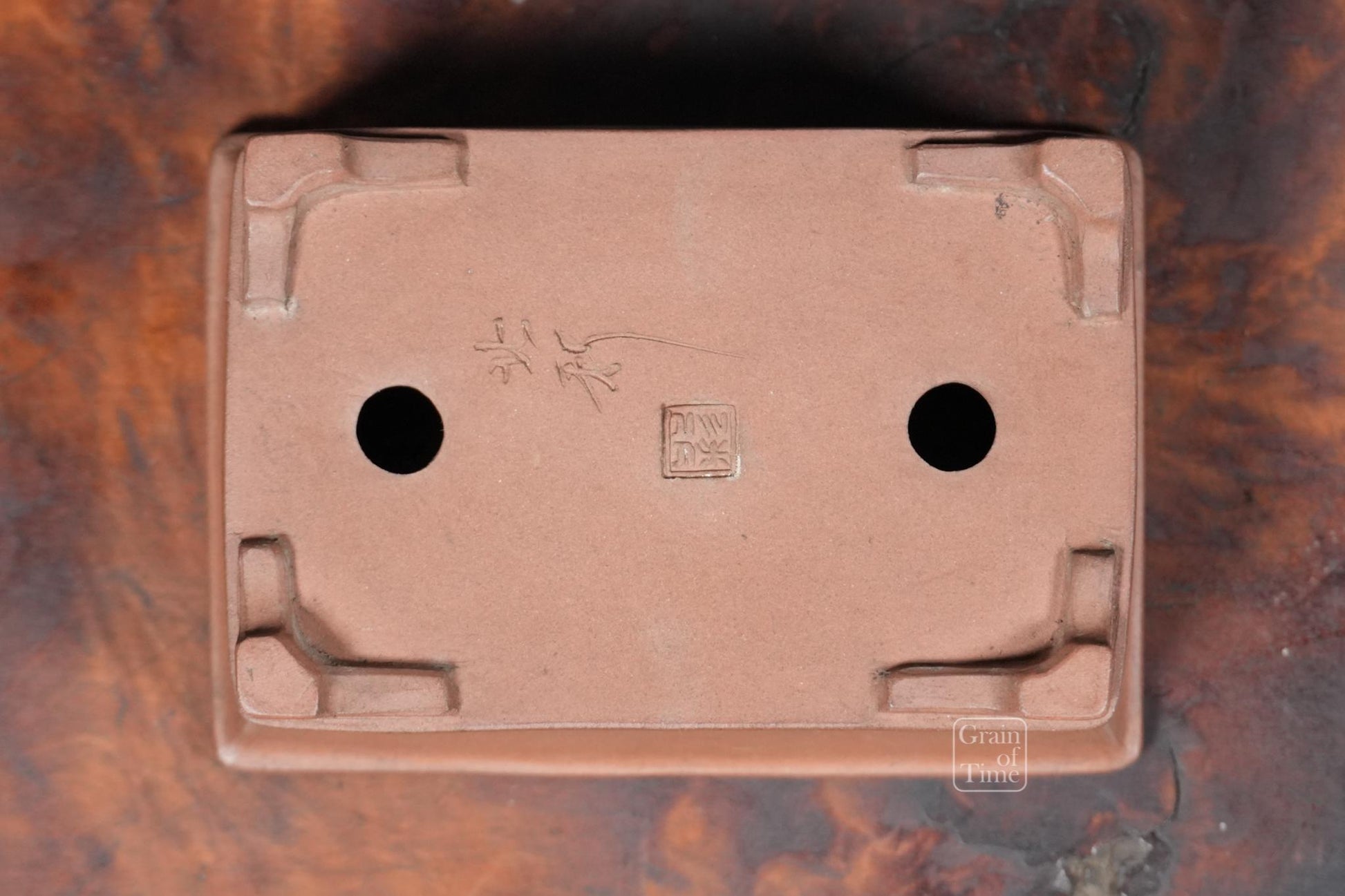 Hokusai, Real name: Morihiko Yamamoto, born 1916, Aichi pref. Signature "Qing festival, Northern Colour". Not the famed woodcut artist! His family business was tile making, and he began making bonsai pots some time between 1941-55. Originally he fired pieces in local senior potters kilns, those of Sanshu Ichiyo, Sugiura Fukuho and Mitsutoen. In 1971, he built his own kiln and arrived at a method of firing wares for a long time that gave him the look he wanted. I believe this would have felt logical as traditional Chinese firings were very long.