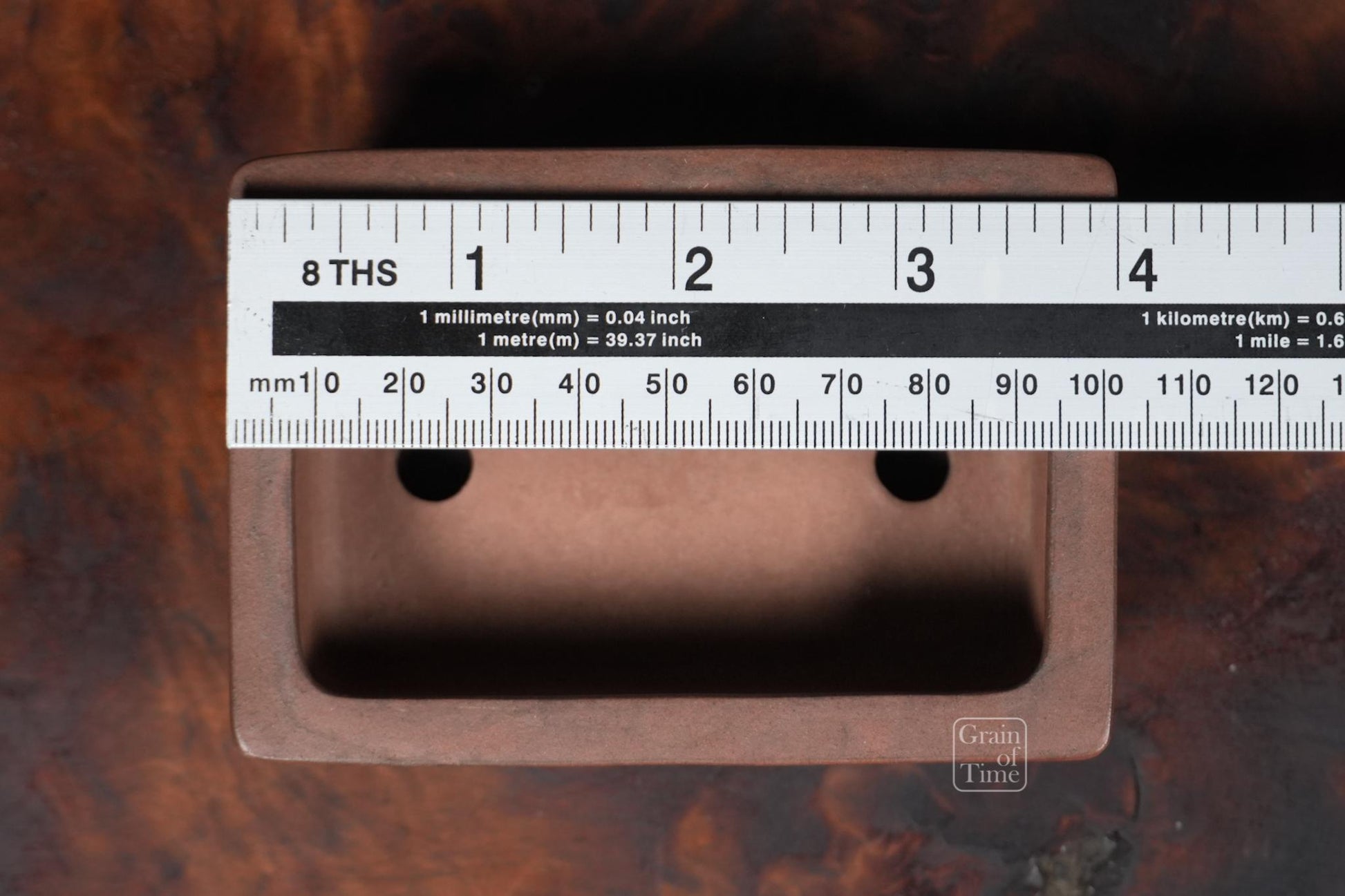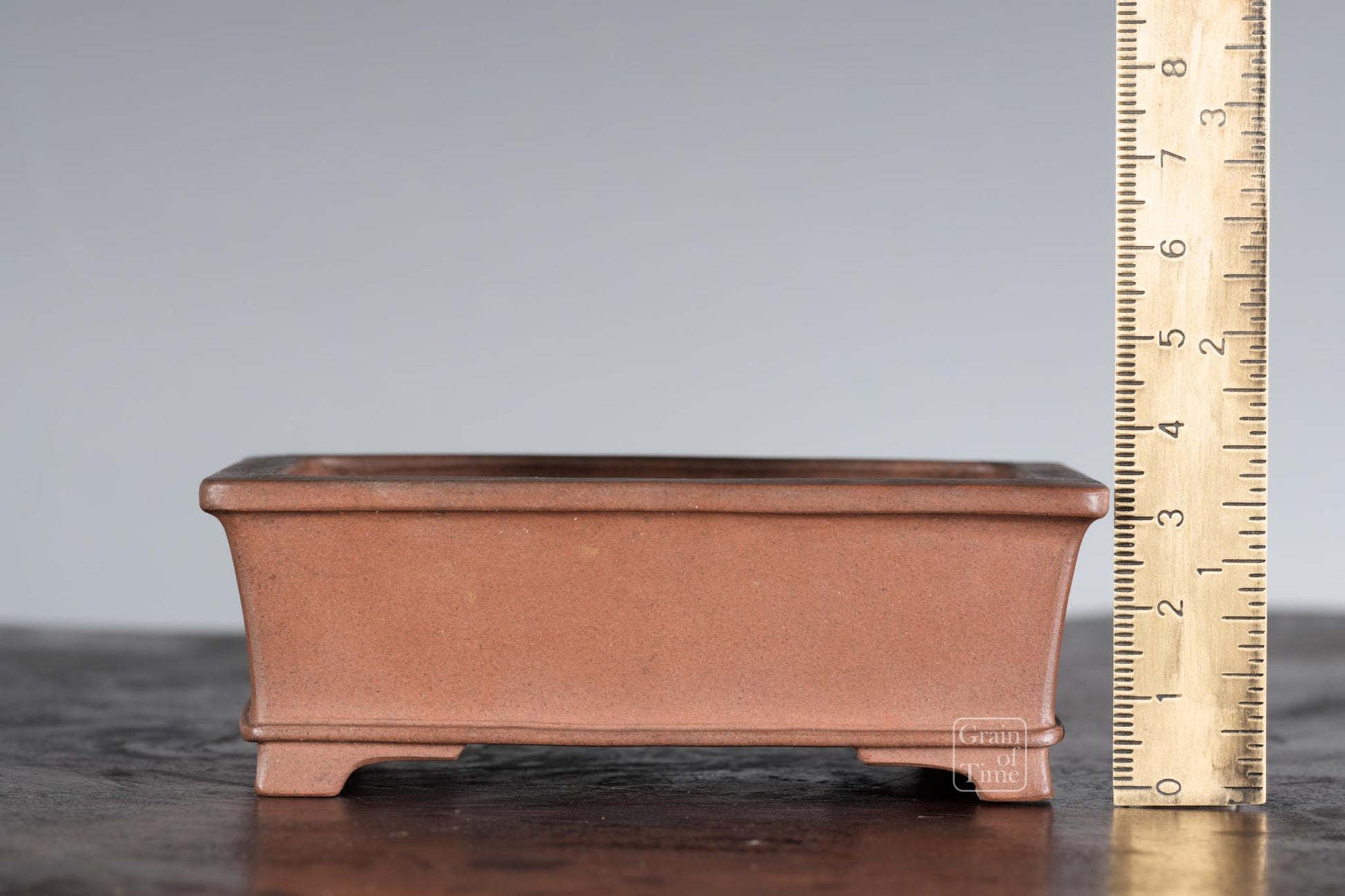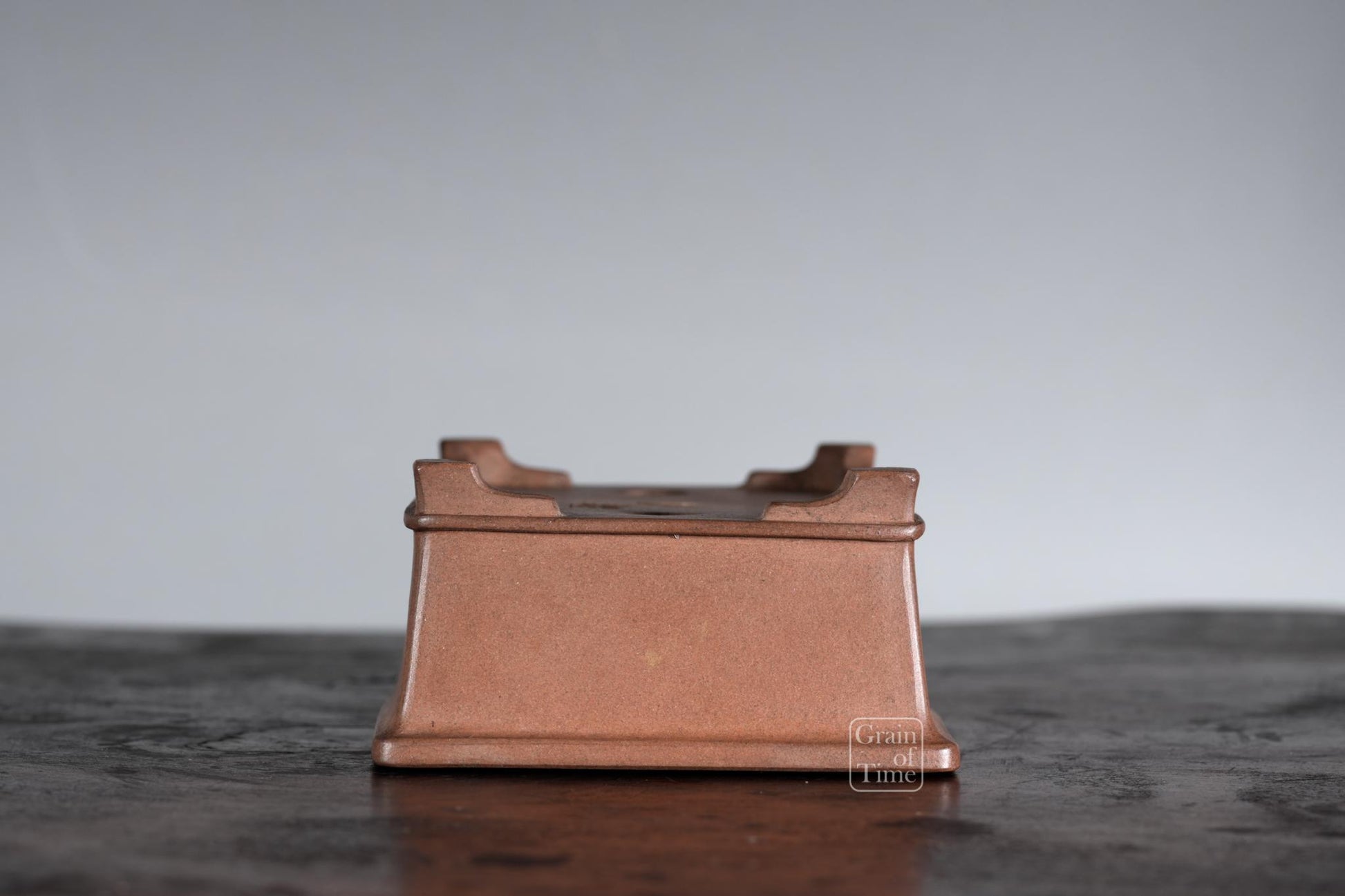 Hokusai, Real name: Morihiko Yamamoto, born 1916, Aichi pref. Signature "Qing festival, Northern Colour". Not the famed woodcut artist! His family business was tile making, and he began making bonsai pots some time between 1941-55. Originally he fired pieces in local senior potters kilns, those of Sanshu Ichiyo, Sugiura Fukuho and Mitsutoen. In 1971, he built his own kiln and arrived at a method of firing wares for a long time that gave him the look he wanted. I believe this would have felt logical as traditional Chinese firings were very long.