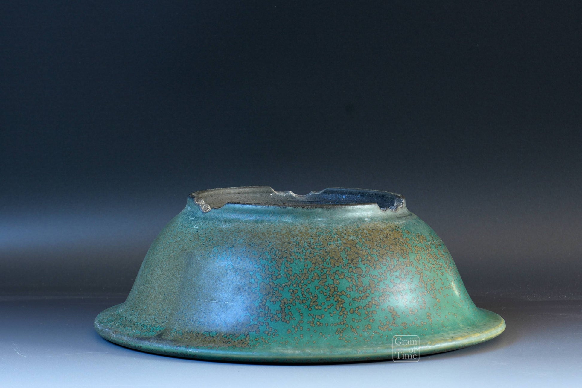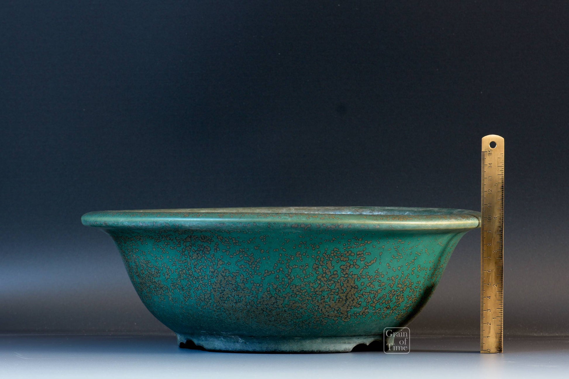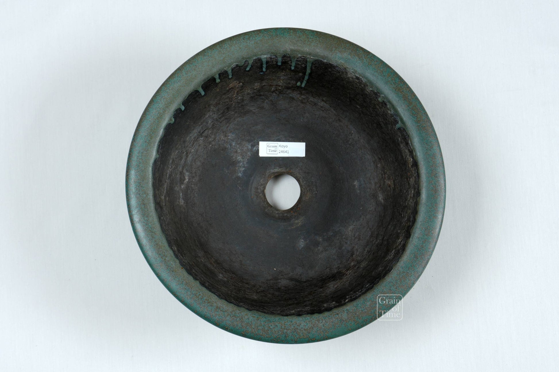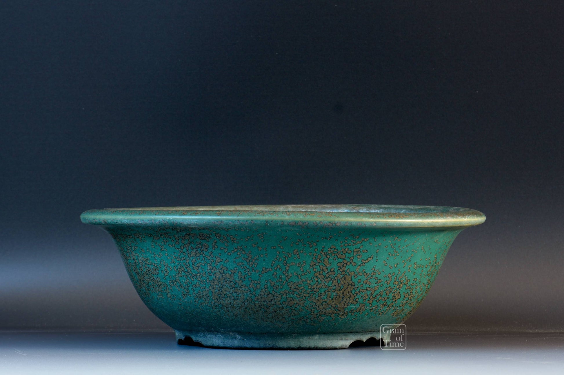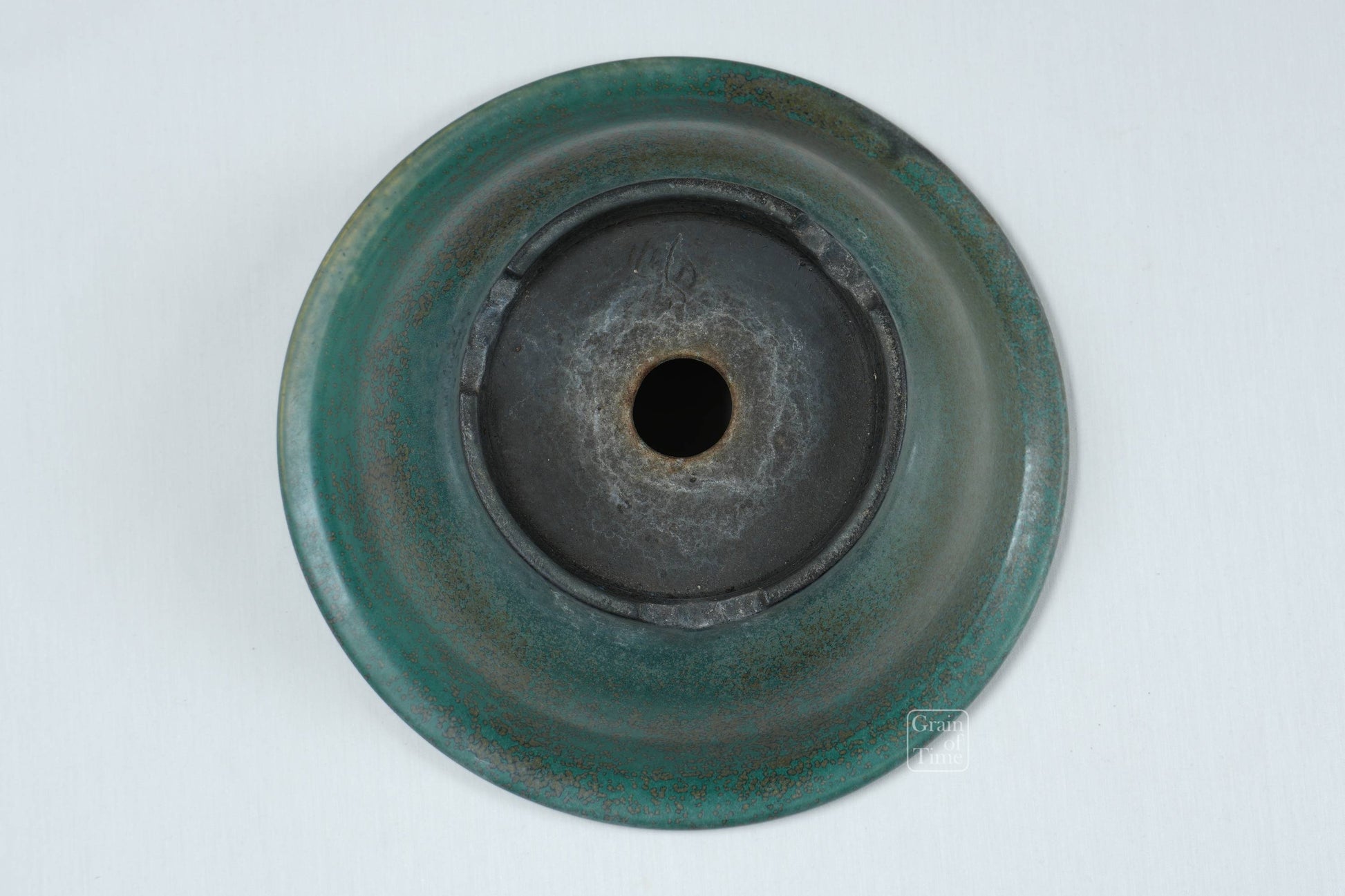 Japanese bonsai pot by Aiba Kouyou / Koyou / Koyo of Tokoname. Round pot with external rim, cut foot ring, Oribe green crystalline glaze over, signature of Koyo underneath.