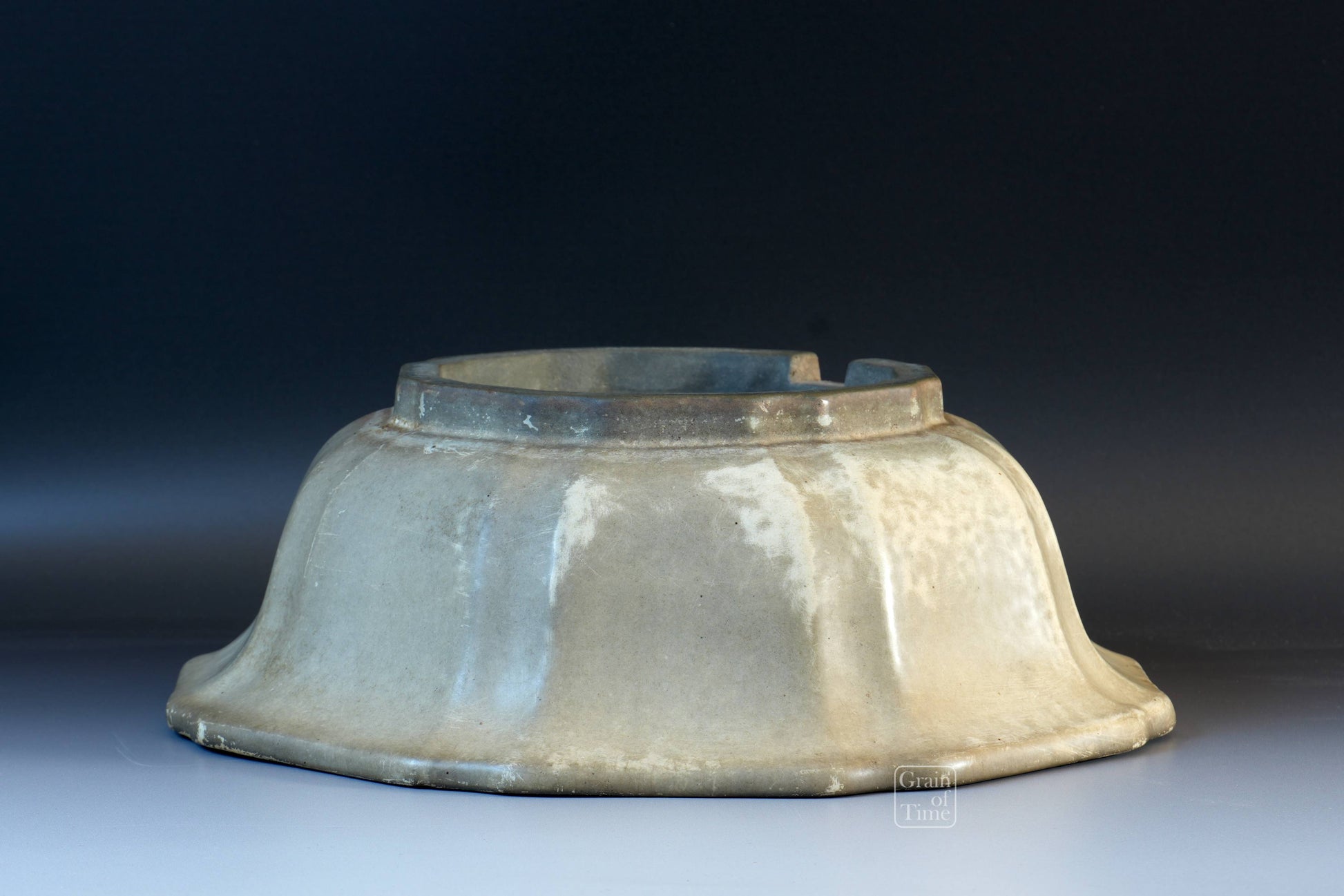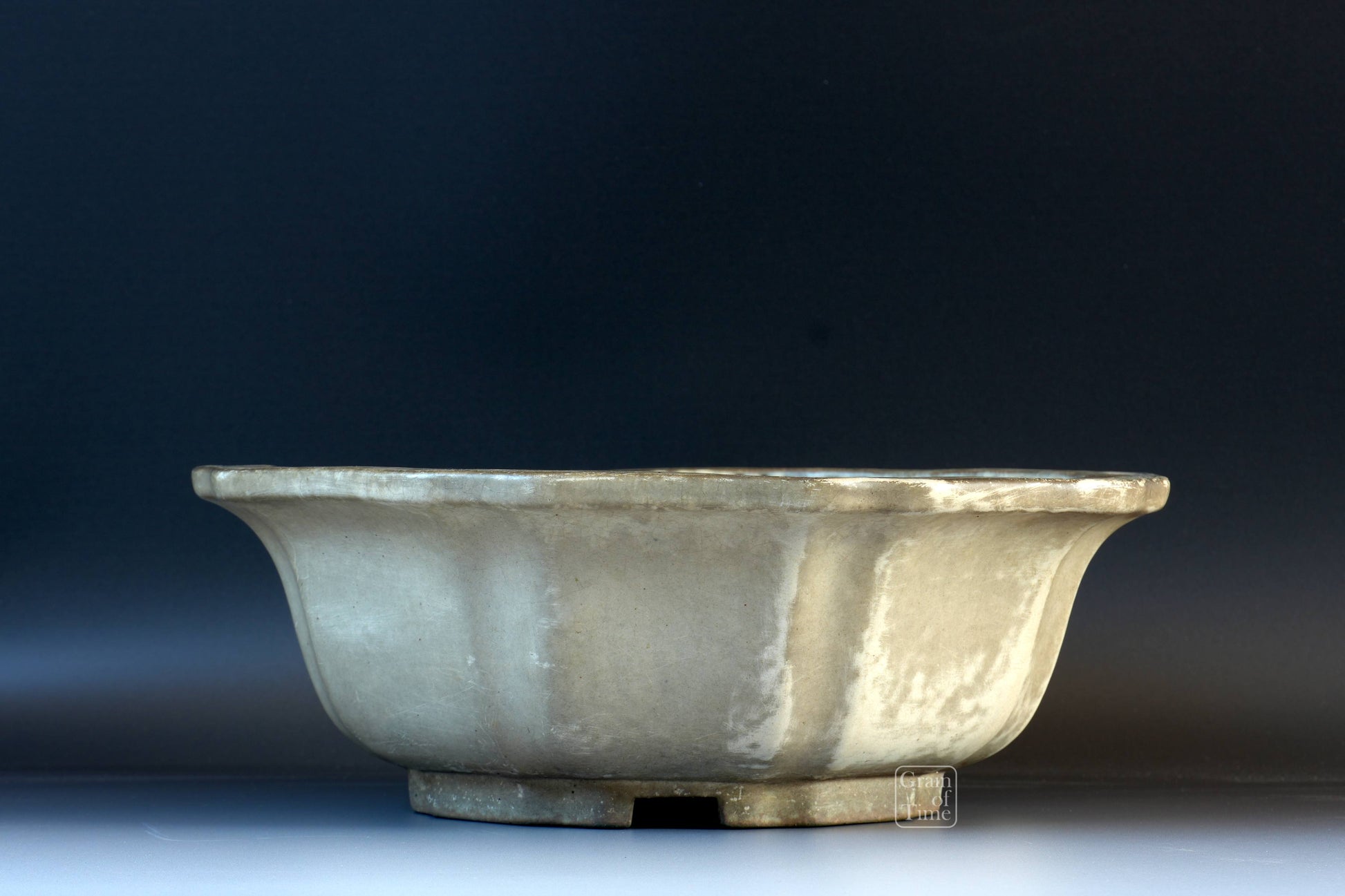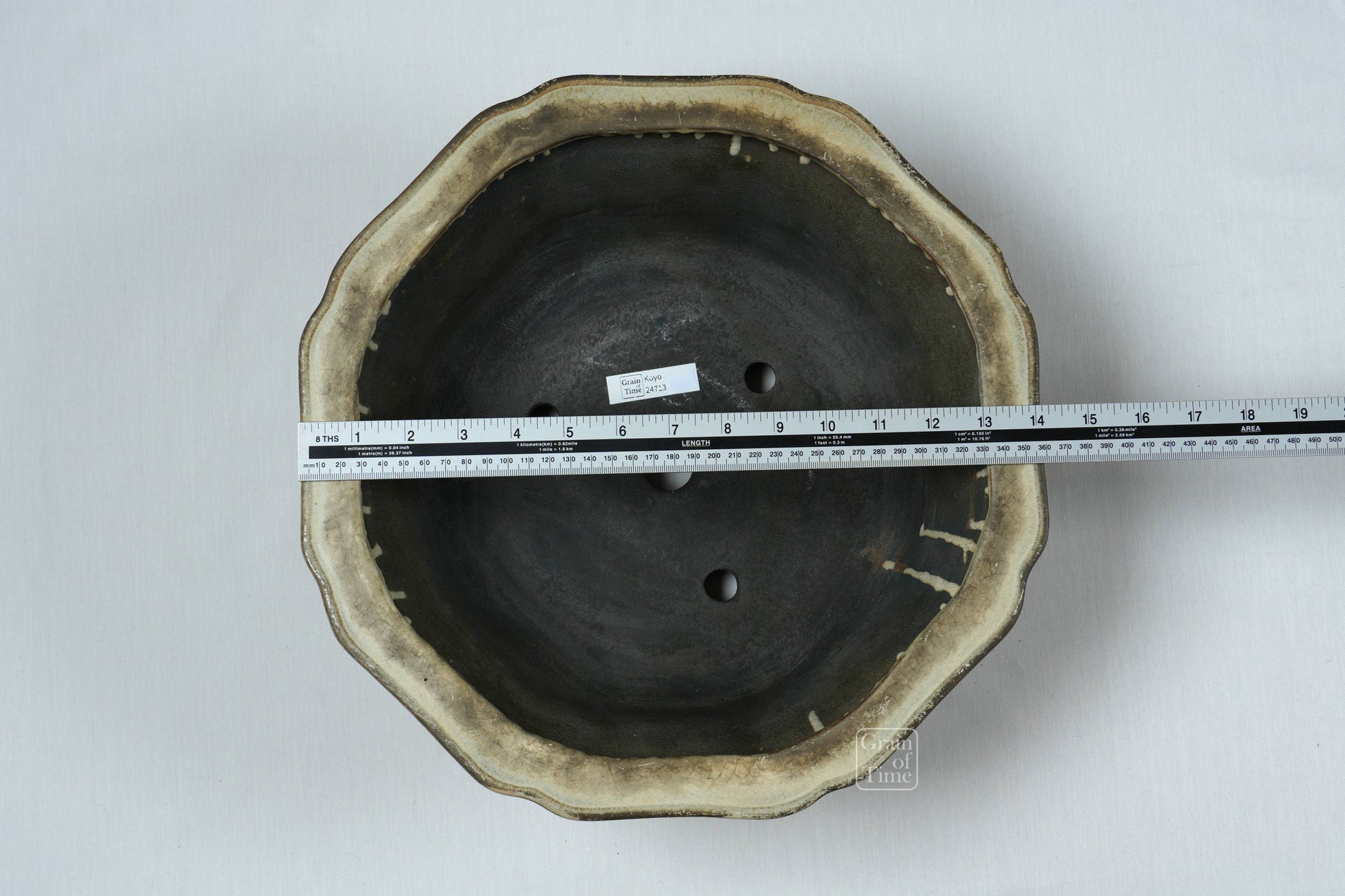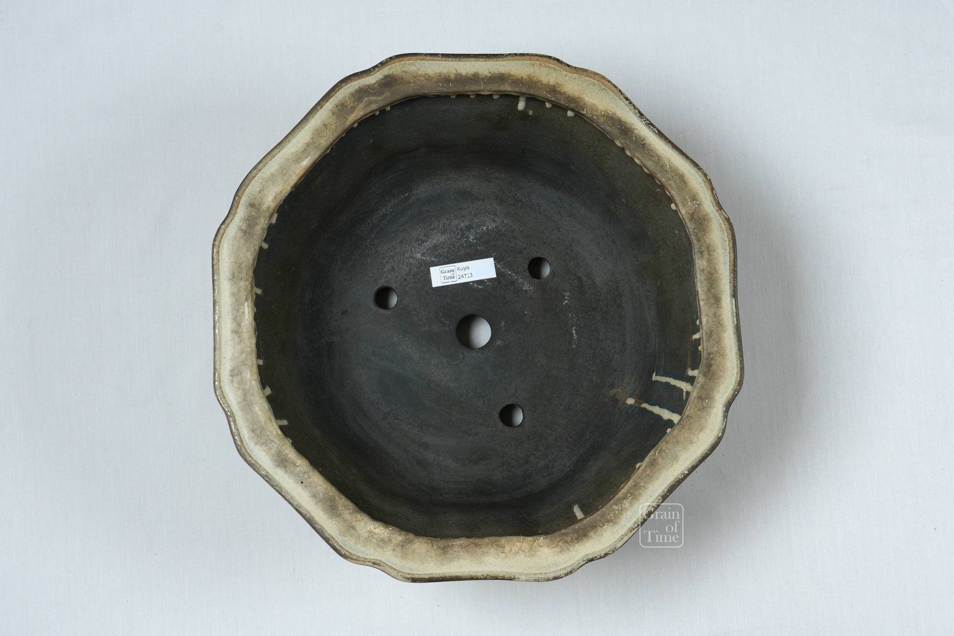 Rarely available large semi-cascade pot, this is a perfect match for a larger flowering semi-cascade tree. The pot has quite some patina, and this could be toned down somewhat if that's what was desired, but on no account clean the top of the rim or the foot ring! These are really characterful parts of the pot and tell of it's age.