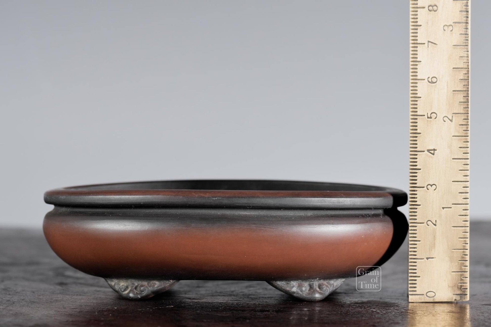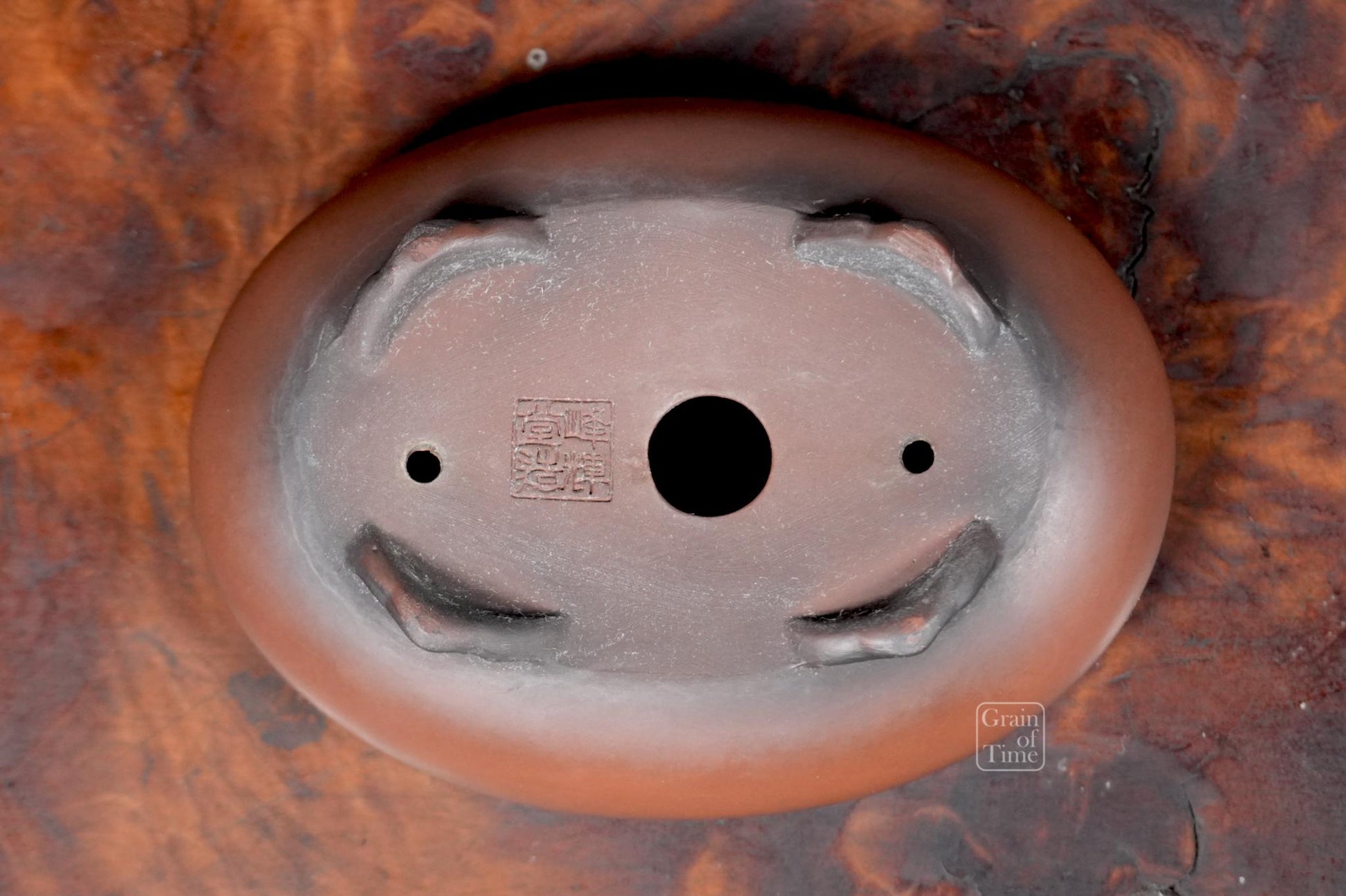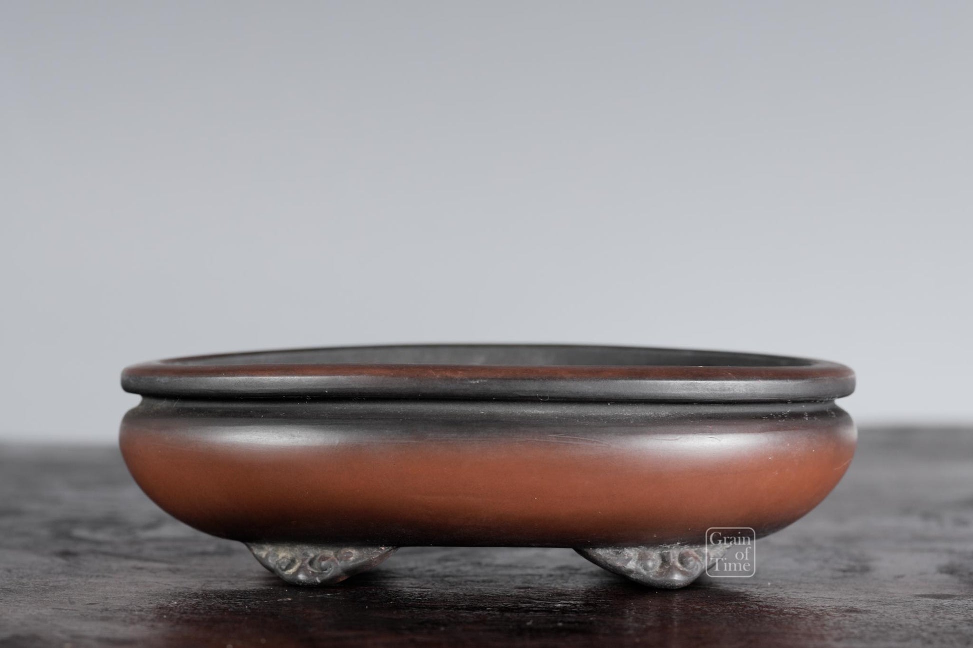 Artisan made Japanese bonsai pot from the Hokido kiln of Tokoname. Oval with bag rim, cloud feet, seal of Hokido underneath.
