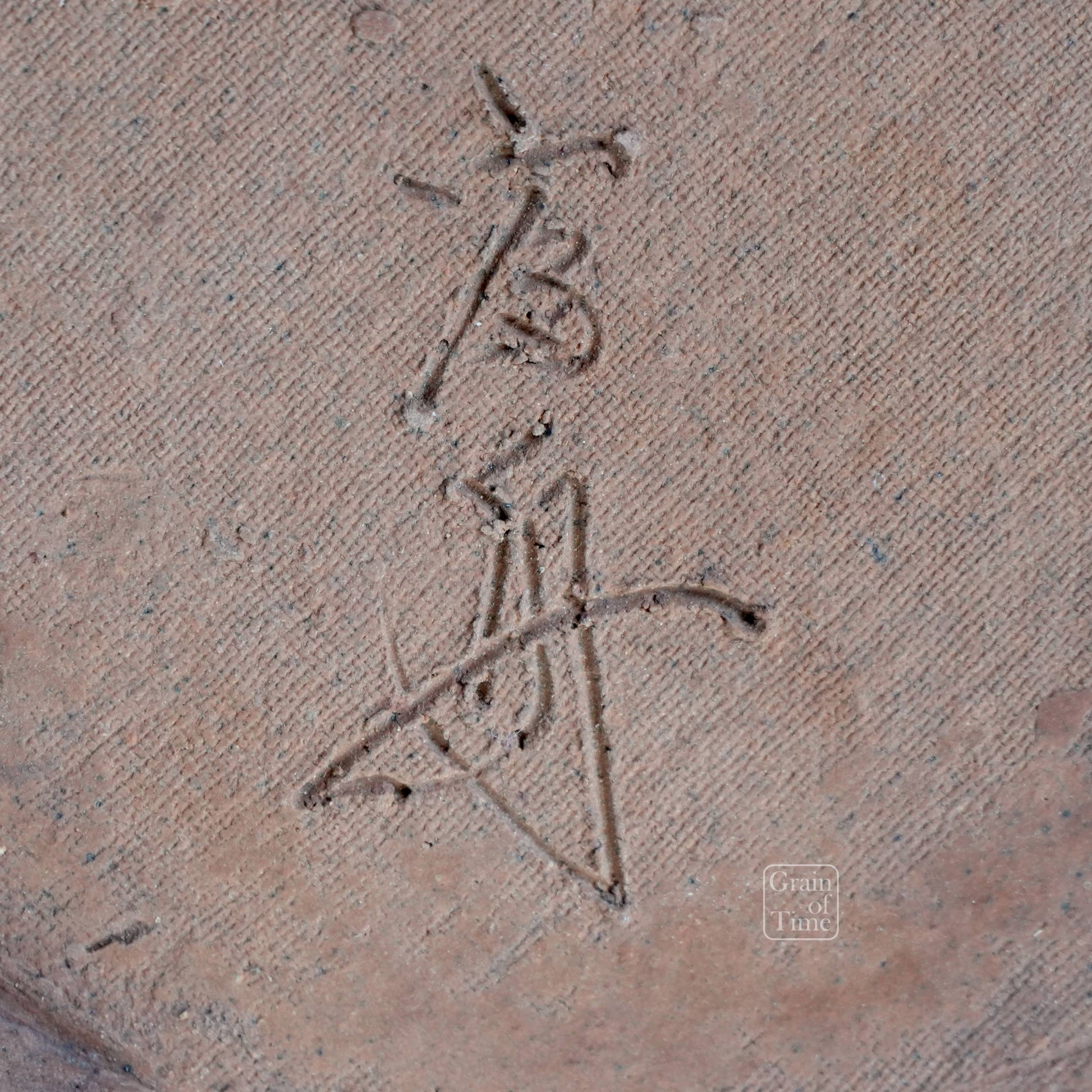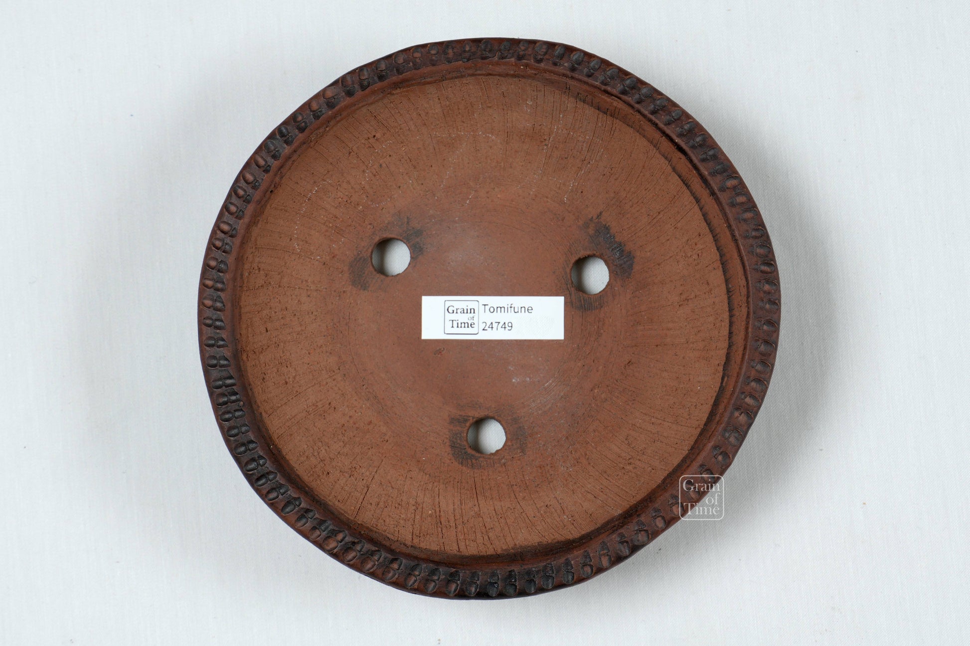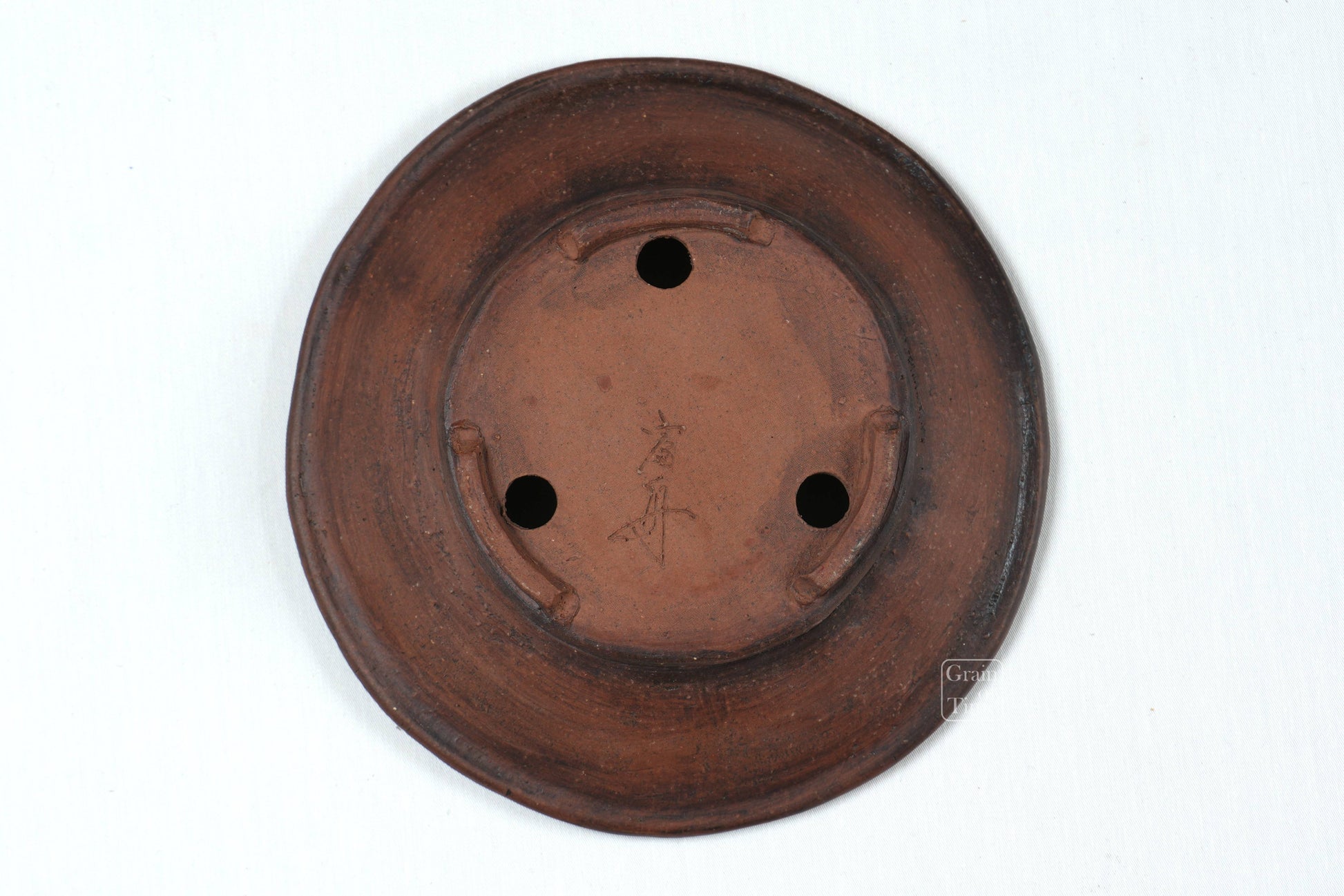 Handmade by Fusyu aka Tomifune of Tokoname. Unglazed round form with external rim and lower band, cut feet and nail signature of Fusyu underneath.