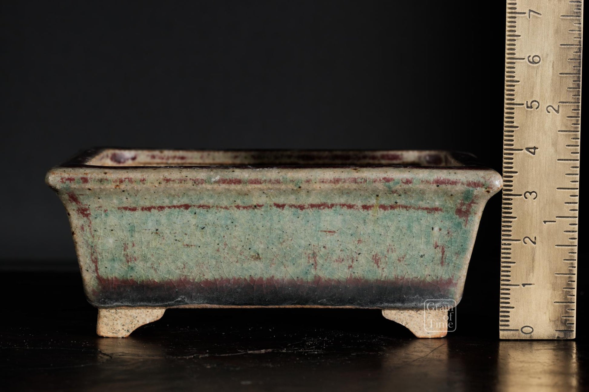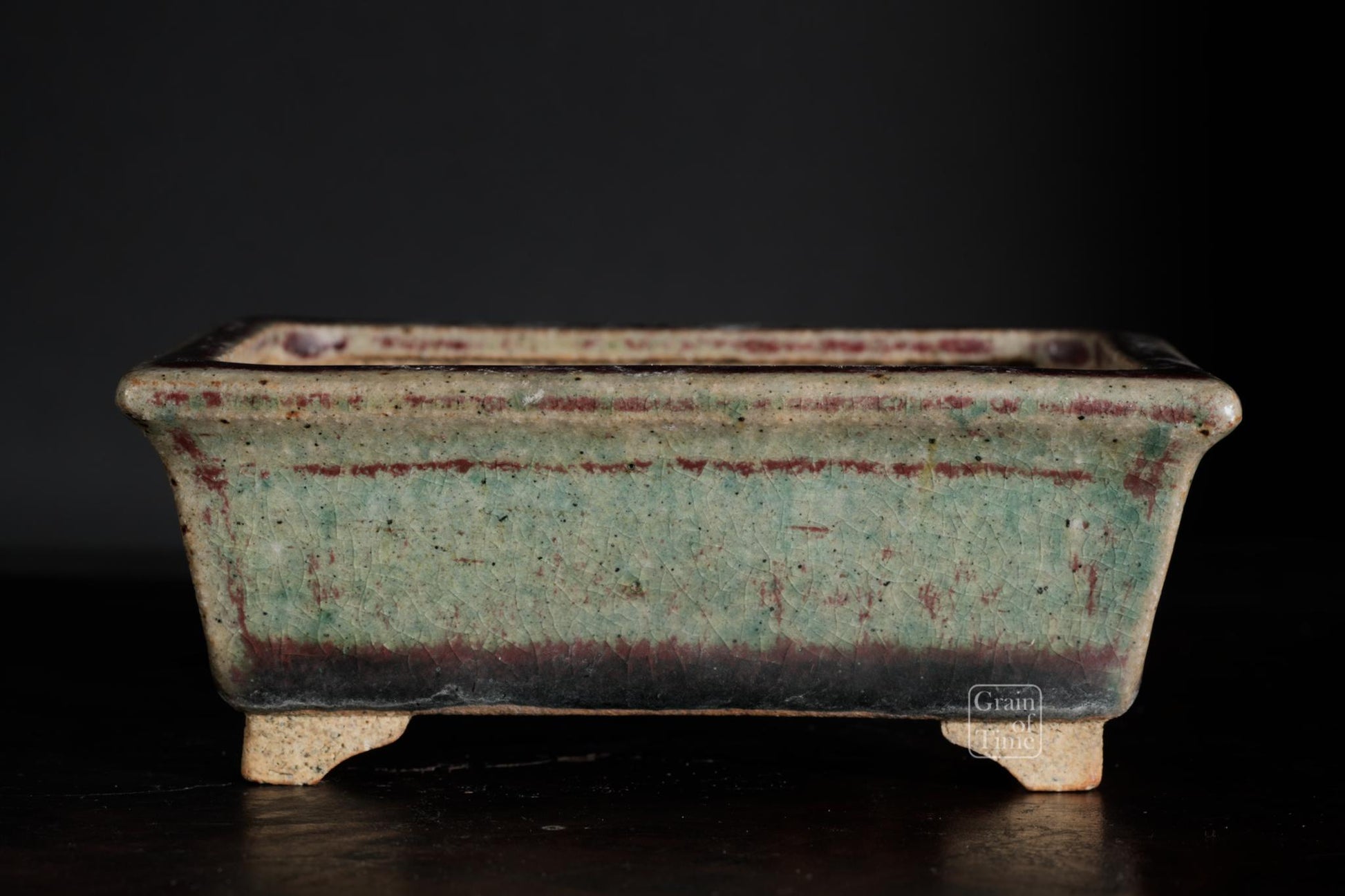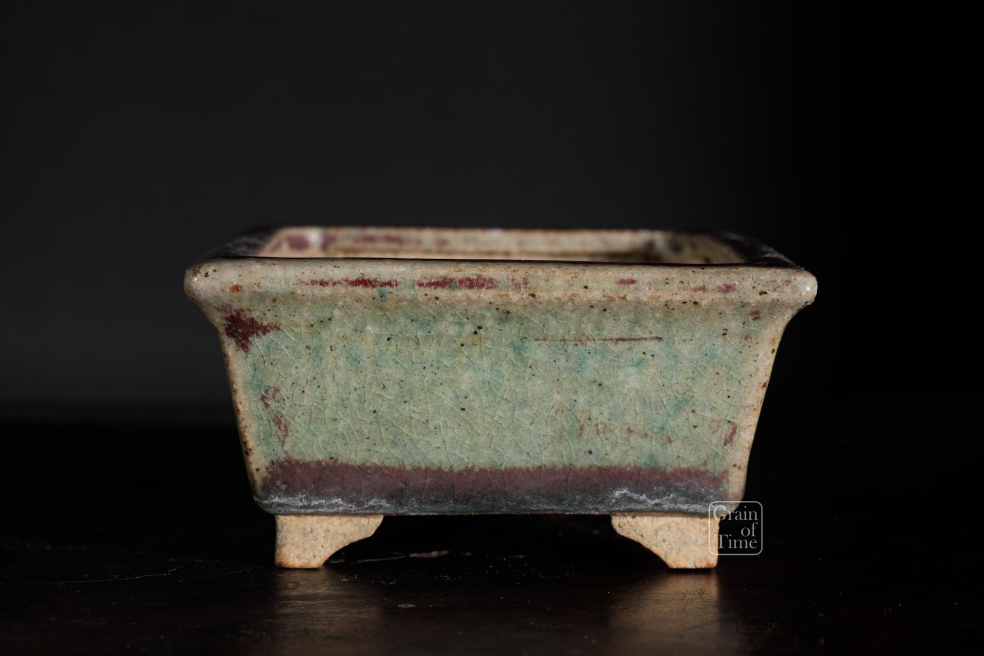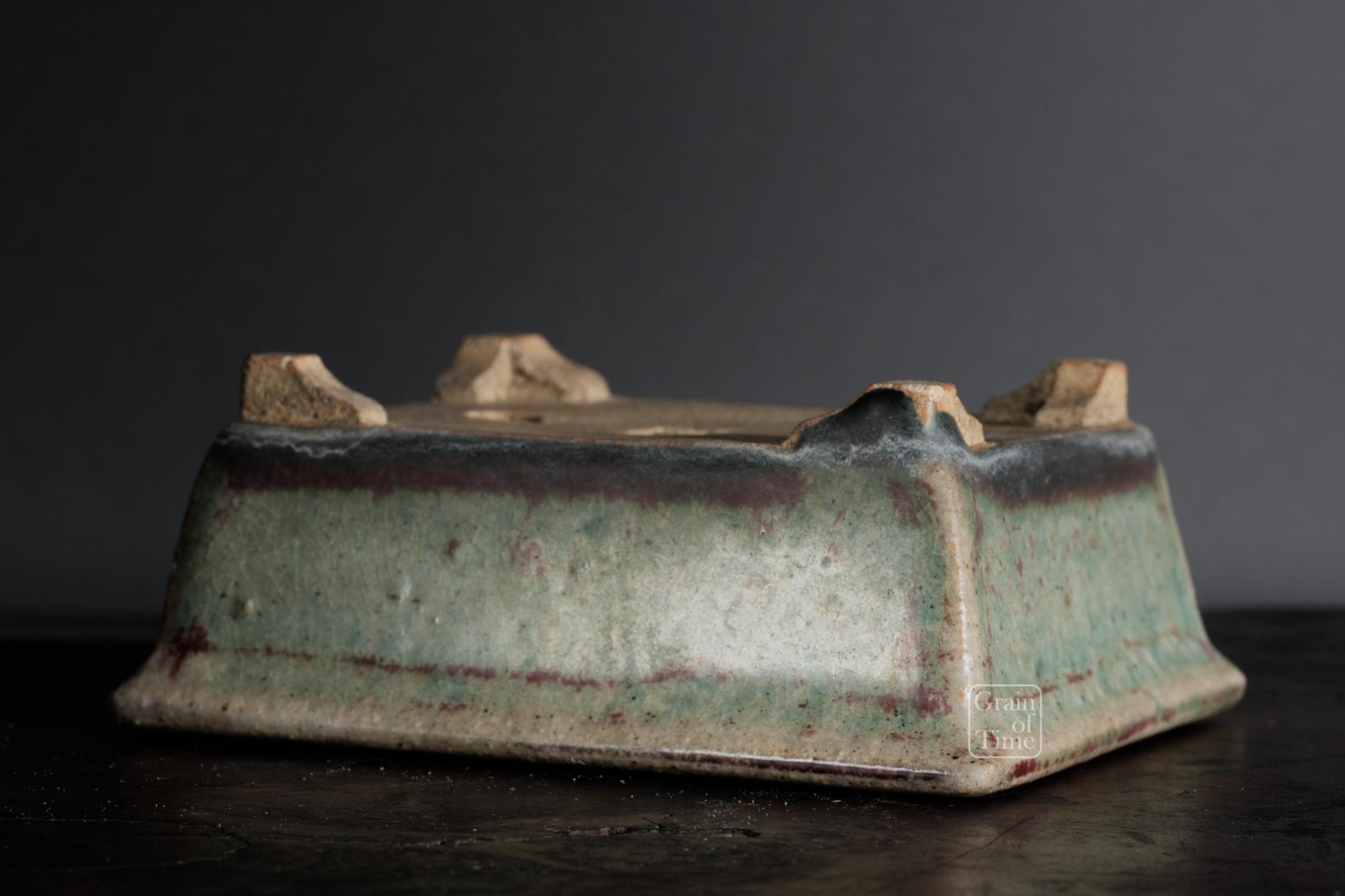 Hand made pot by Keisen Sugiura. Rectangle with external rim, stepped feet, Copper red and green glaze over, seal of Keisen Sugiura underneath.