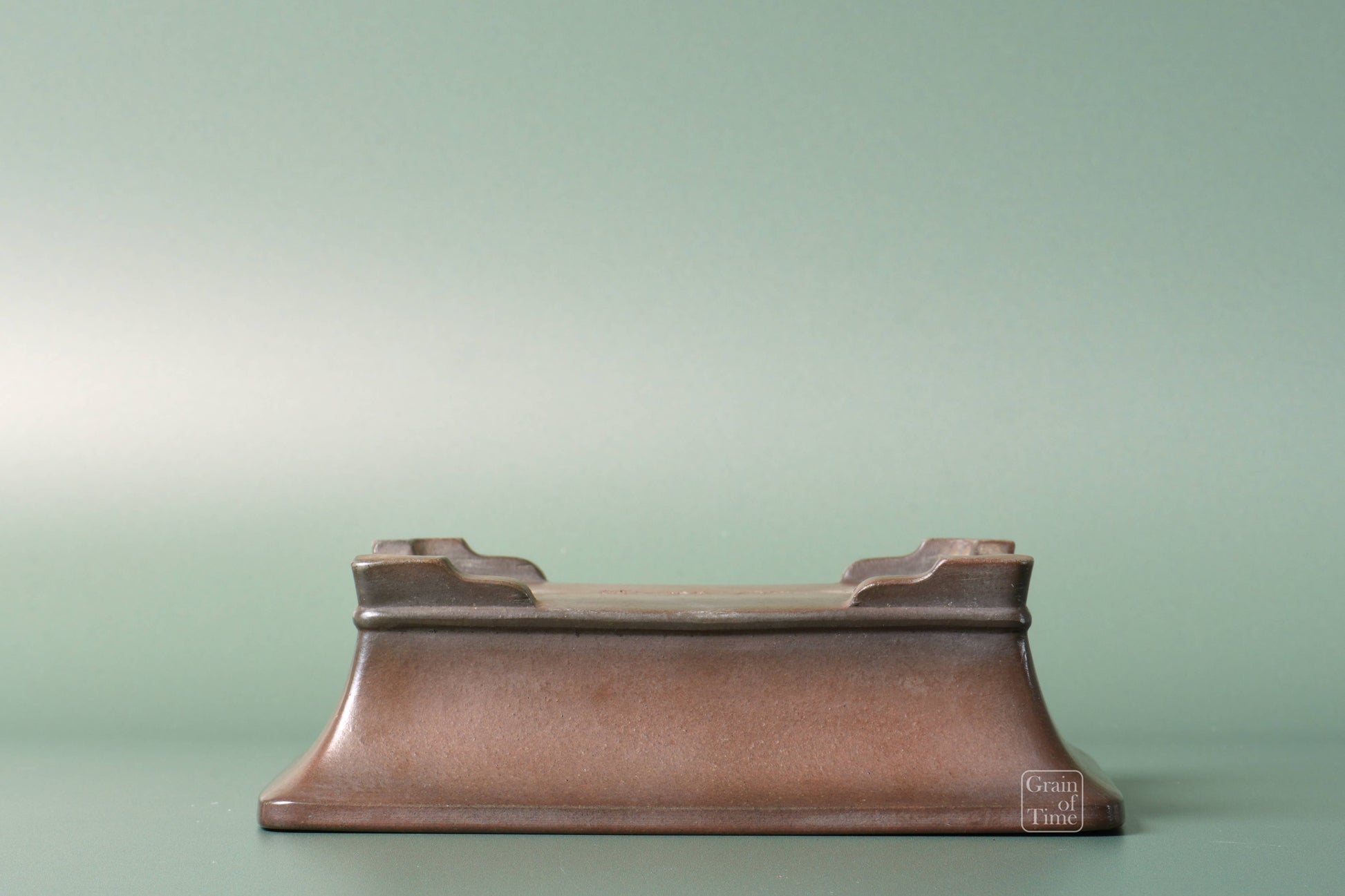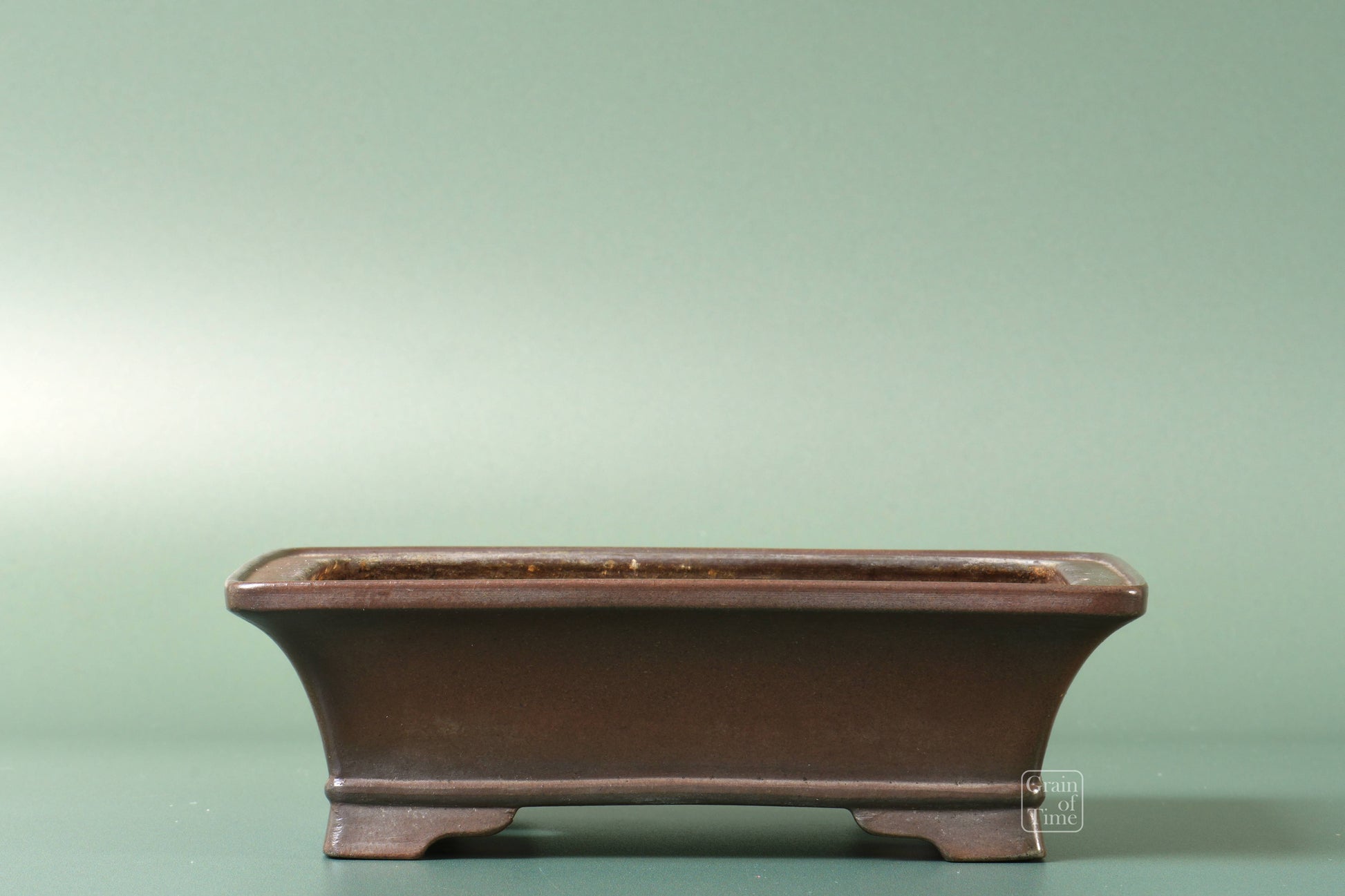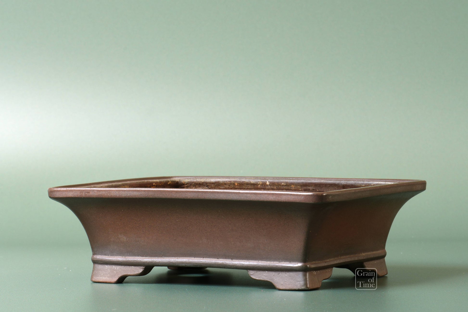 Japanese bonsai pot from the Bigei kiln of Tokoname. Rectangle with external rim, lower band, cut feet with nail signature of Bigei underneath.