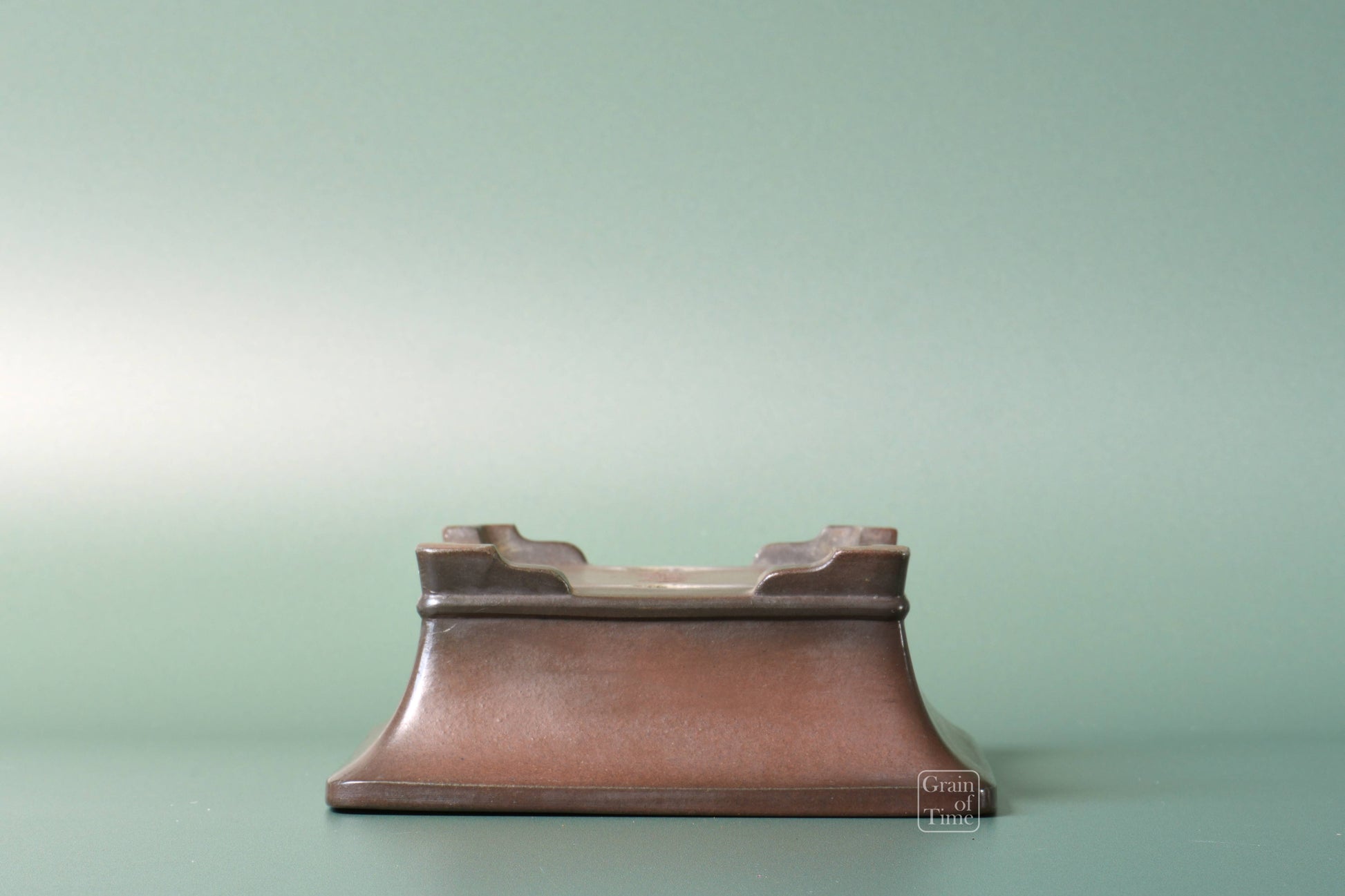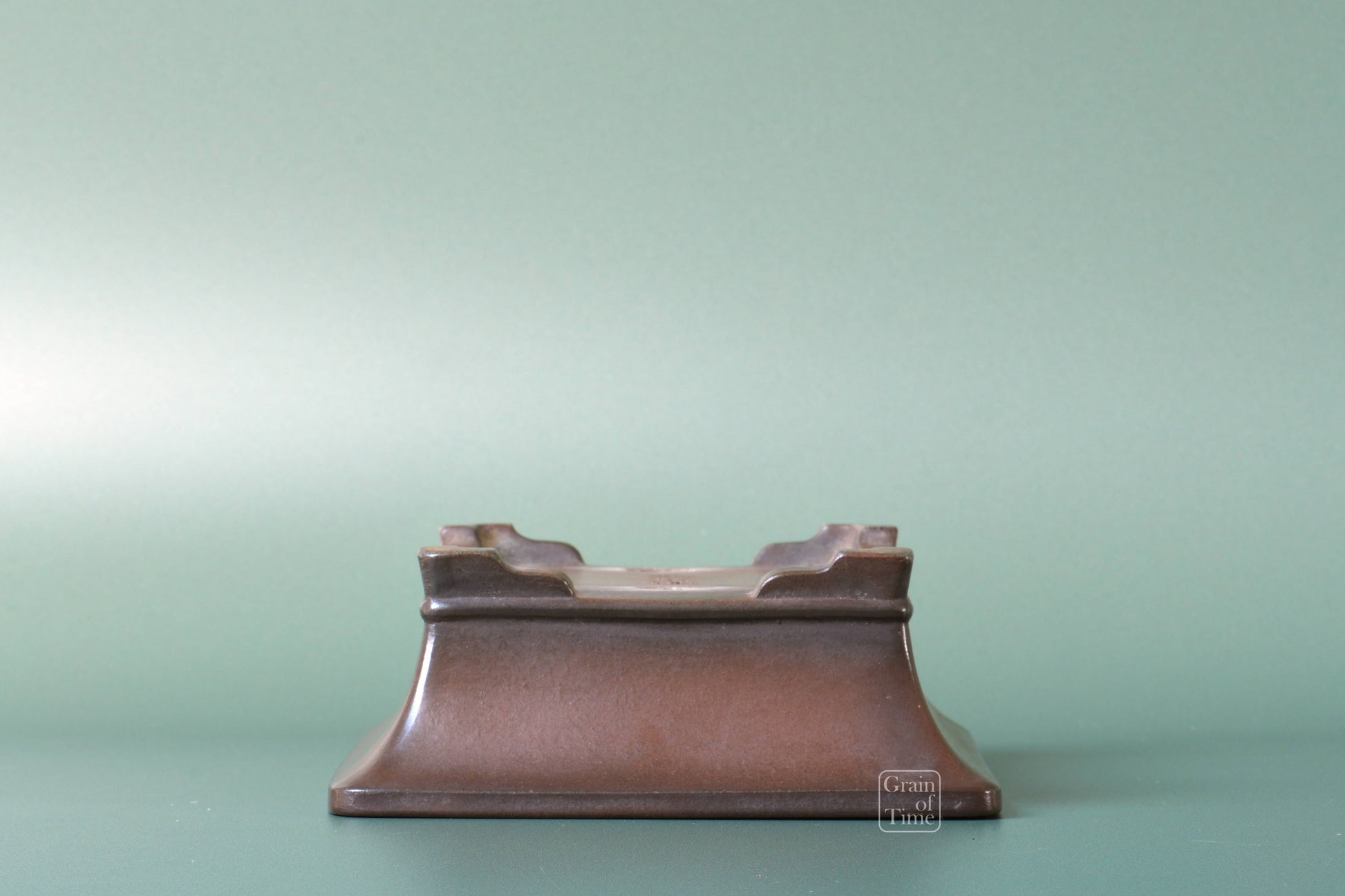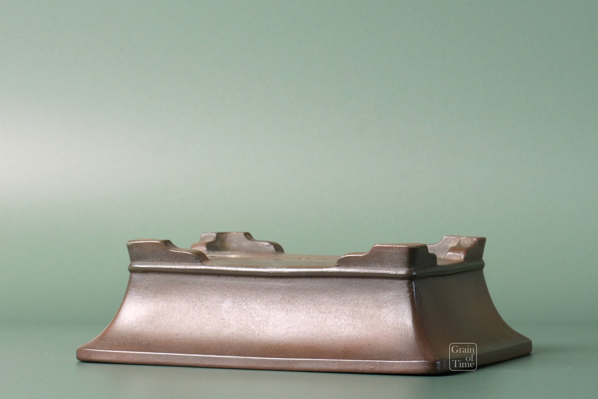 Japanese bonsai pot from the Bigei kiln of Tokoname. Rectangle with external rim, lower band, cut feet with nail signature of Bigei underneath.