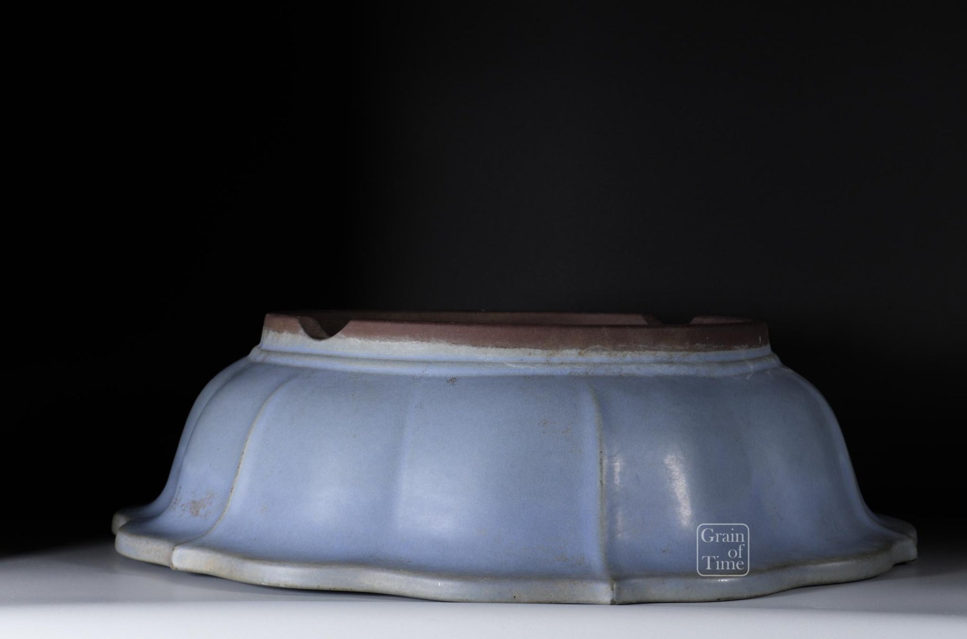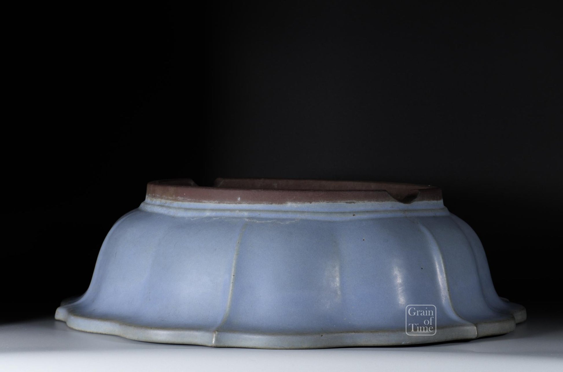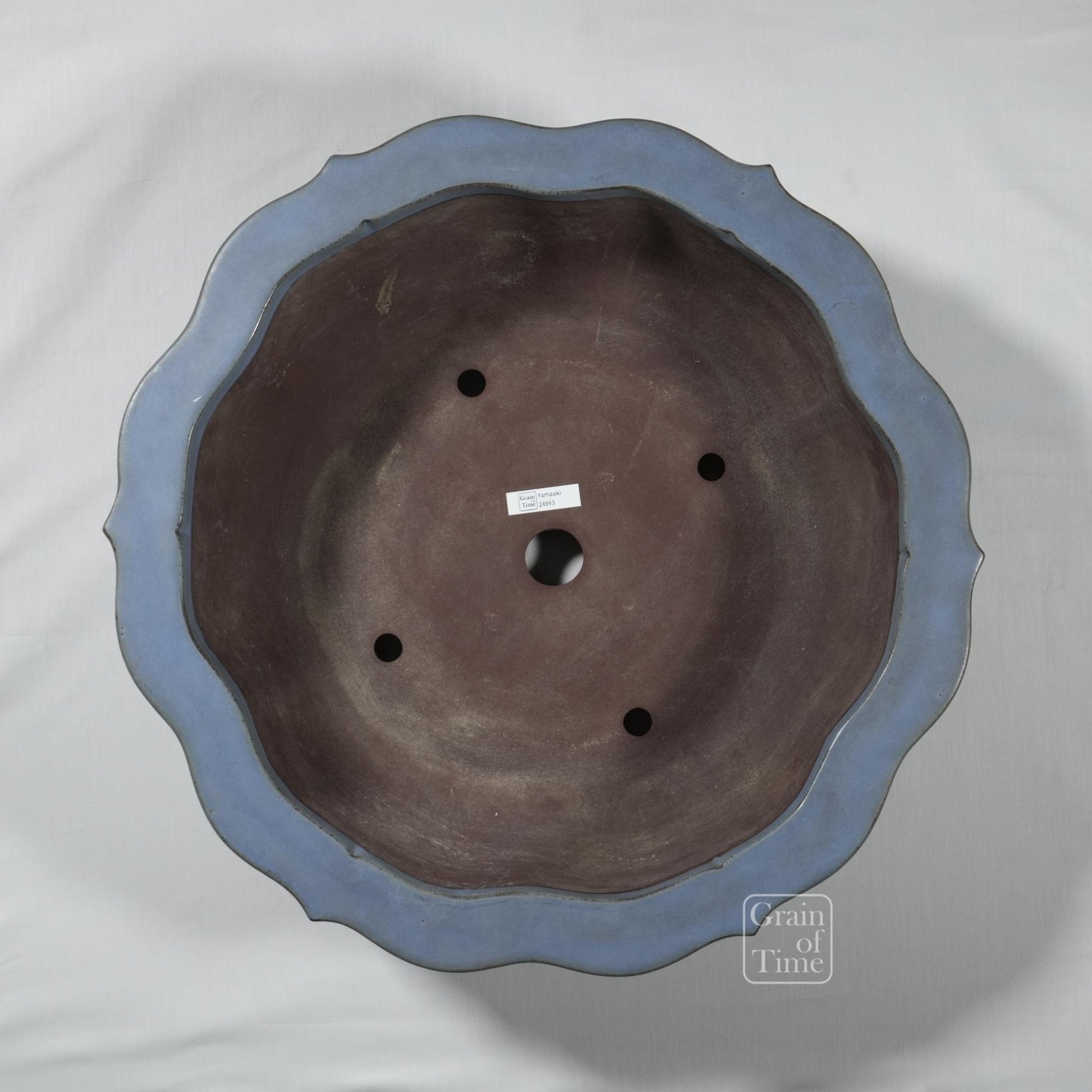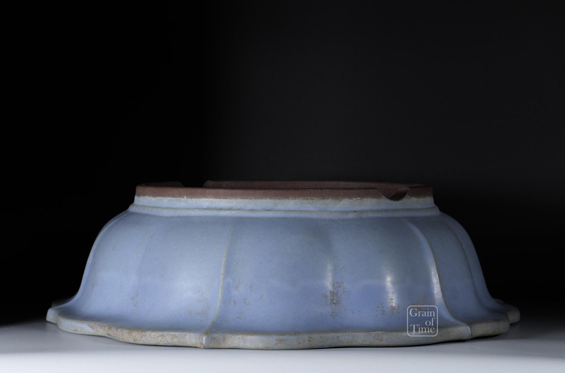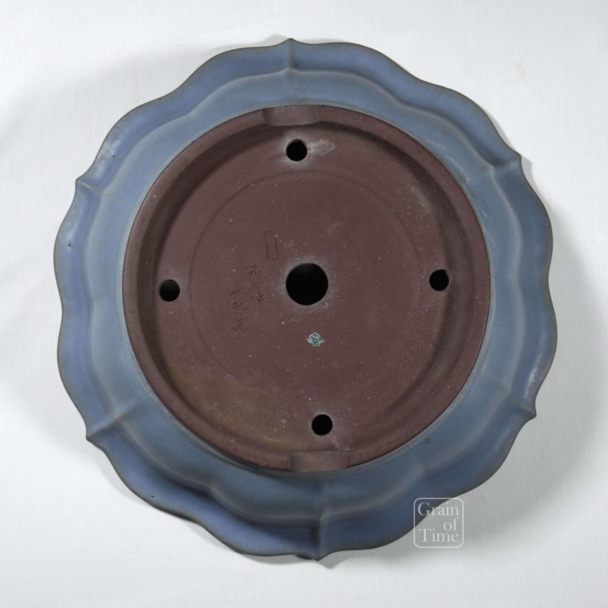 Handmade bonsai pot from the Yamaaki Kiln, 3rd Gen. Toshio. Rinka (flower) shaped pot with external rim, cut foot ring, pale blue glaze over, seal of Yamaaki and hand signed by Toshio underneath.