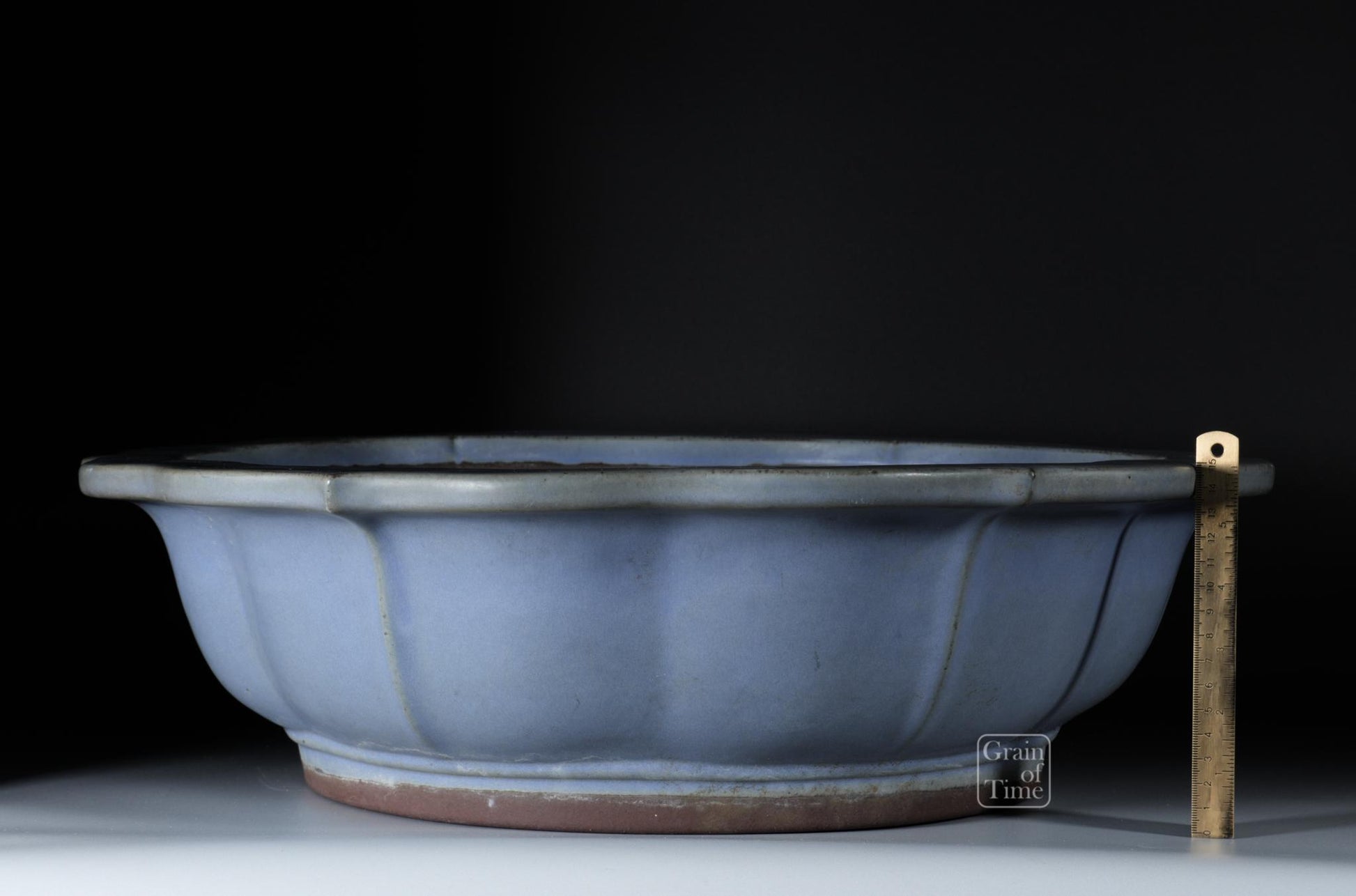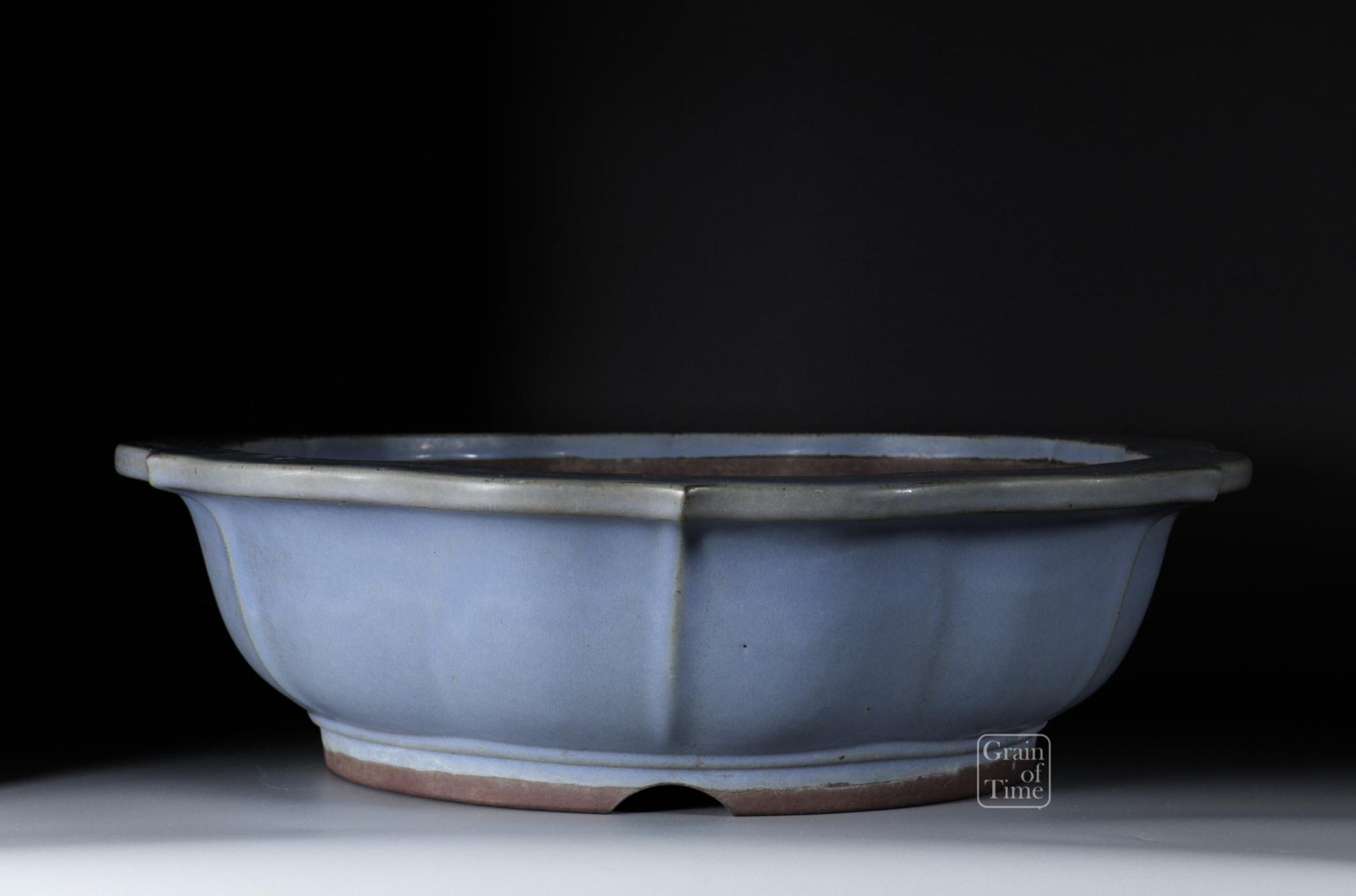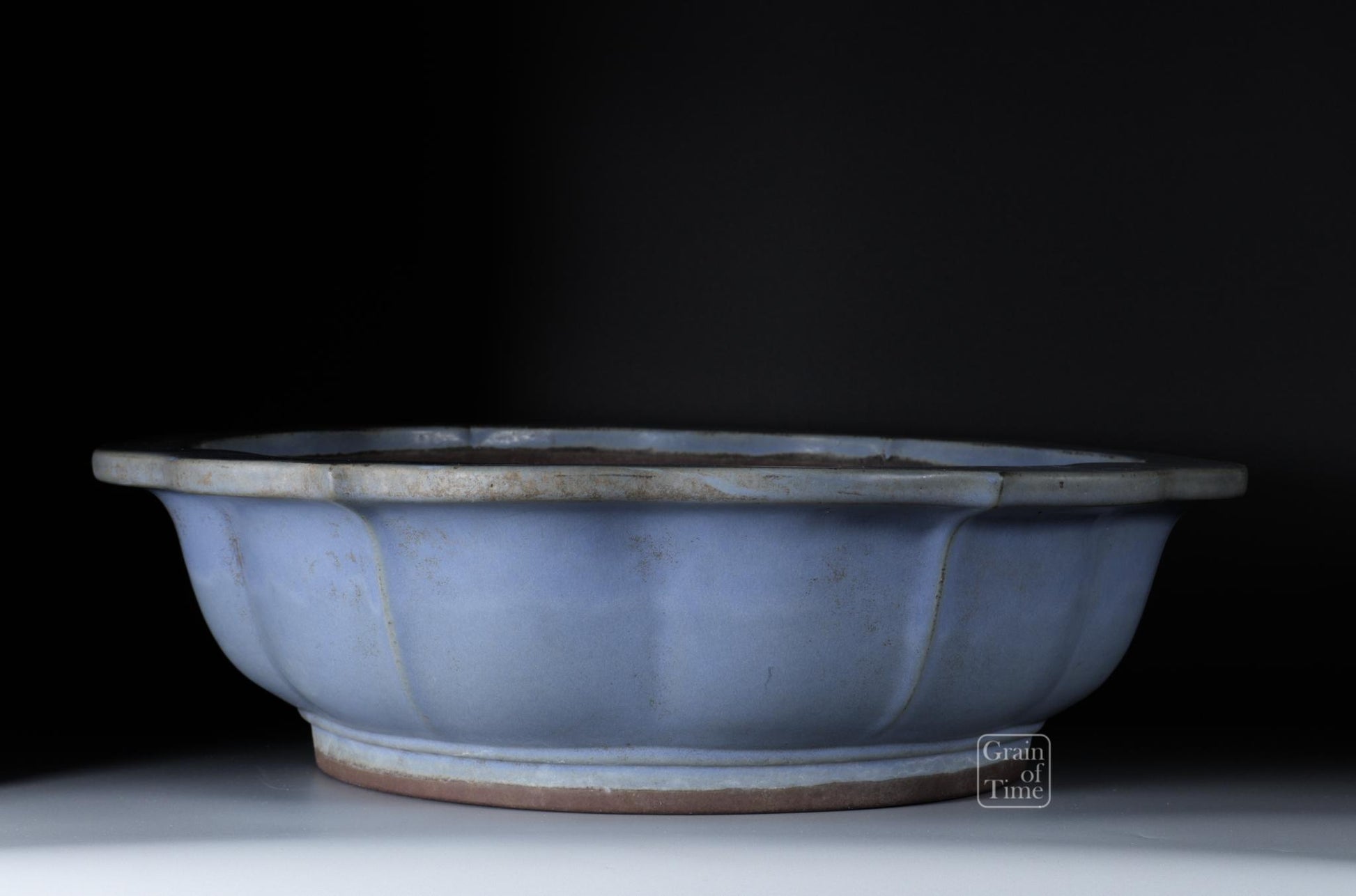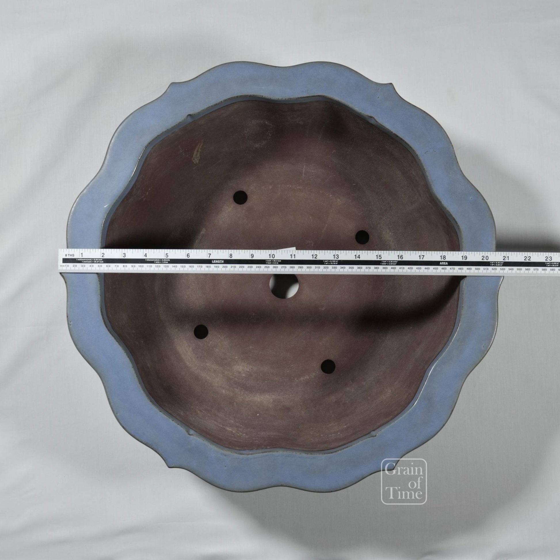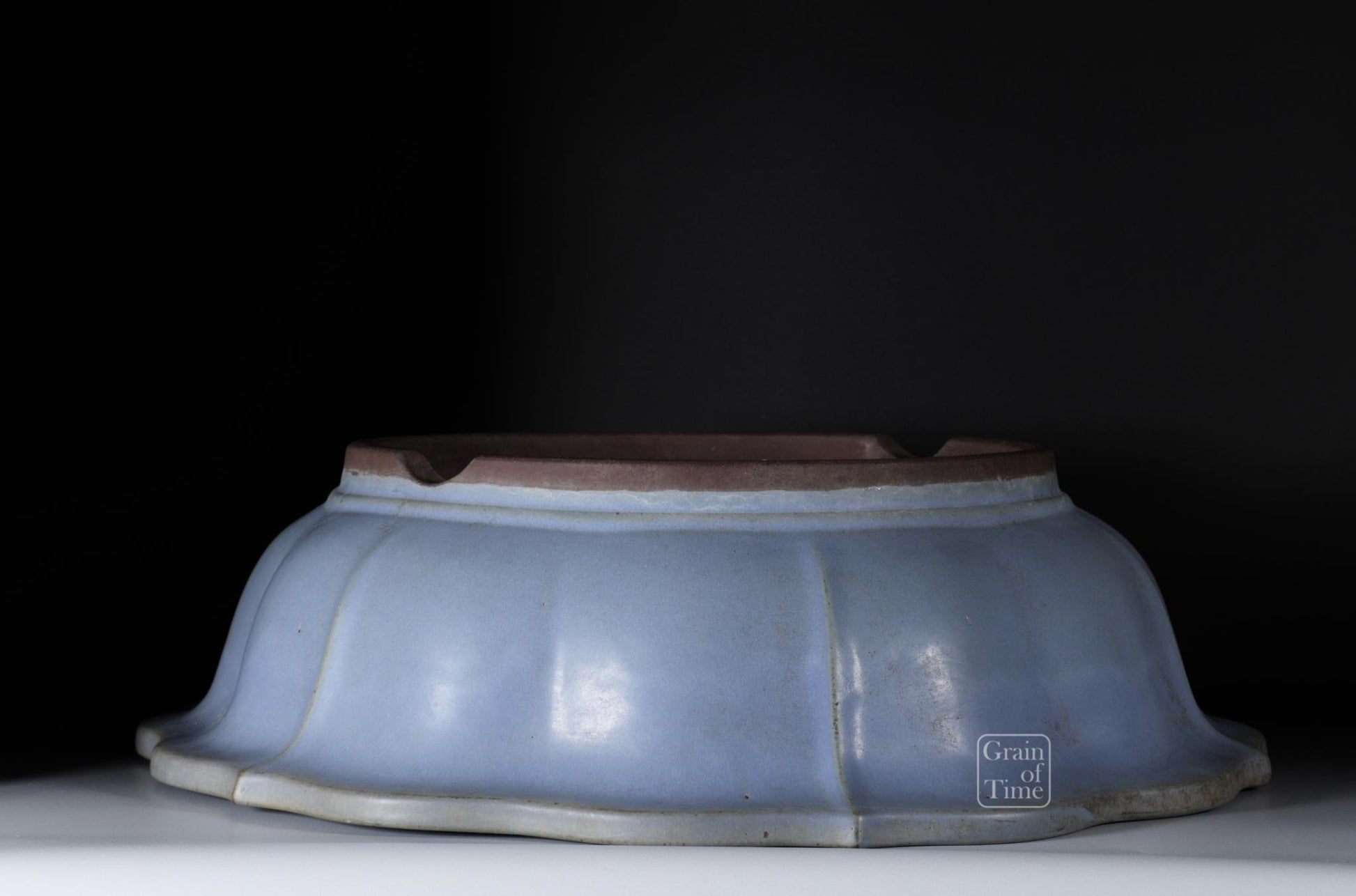 Handmade bonsai pot from the Yamaaki Kiln, 3rd Gen. Toshio. Rinka (flower) shaped pot with external rim, cut foot ring, pale blue glaze over, seal of Yamaaki and hand signed by Toshio underneath.