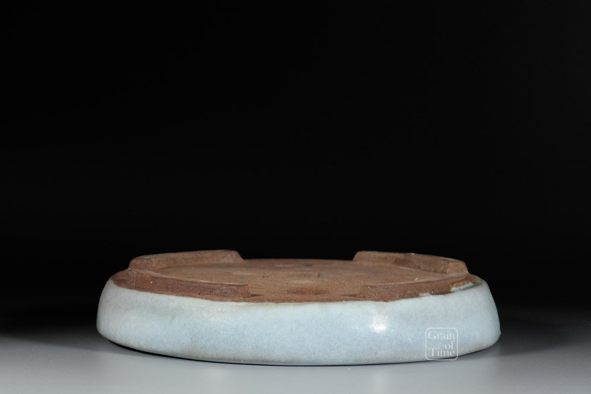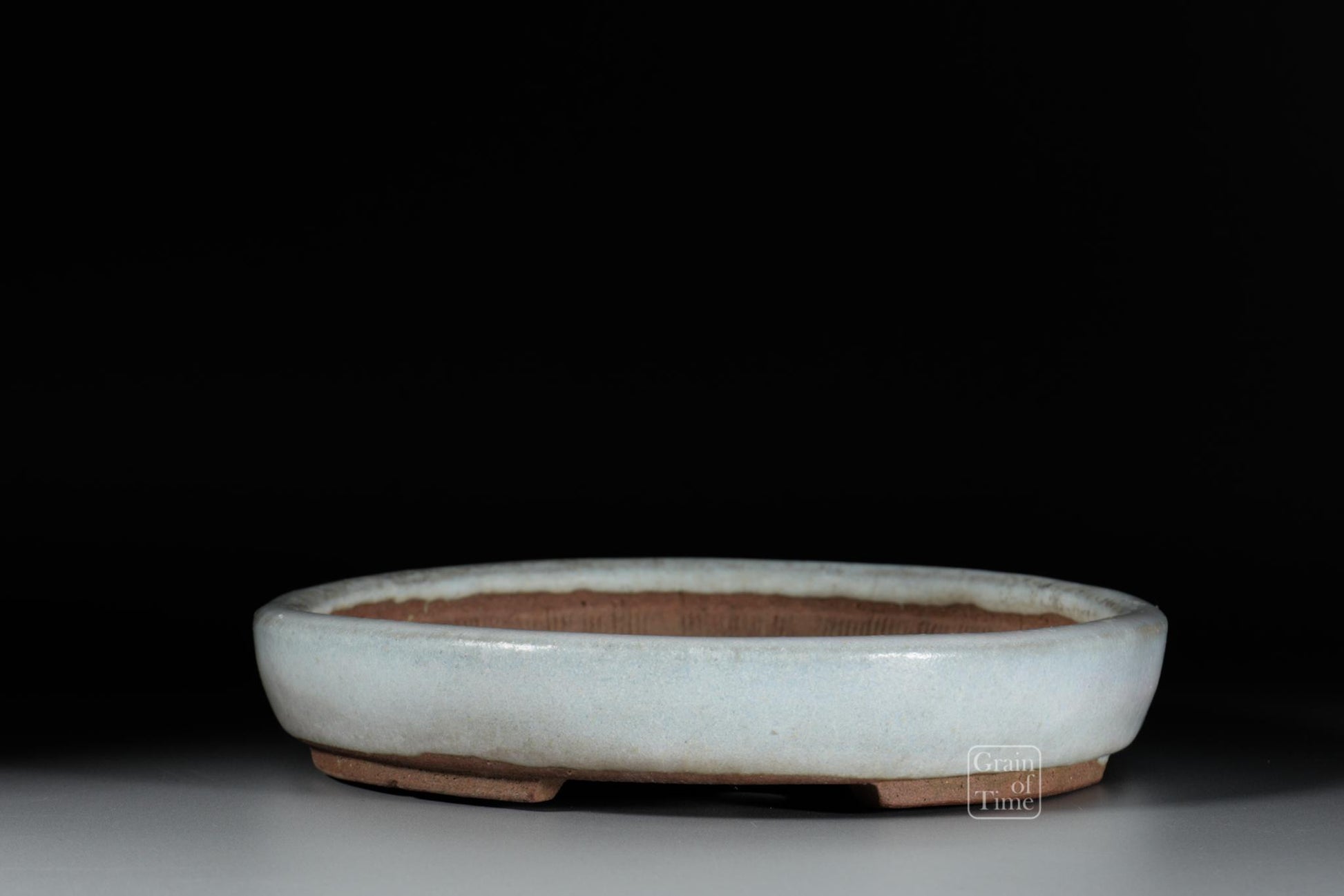 Hand made Japanese bonsai pot by Heian Kosen from Kyoto. Oval with slight internal rim, cut feet, Jun glaze over, seal of Kosen underneath.