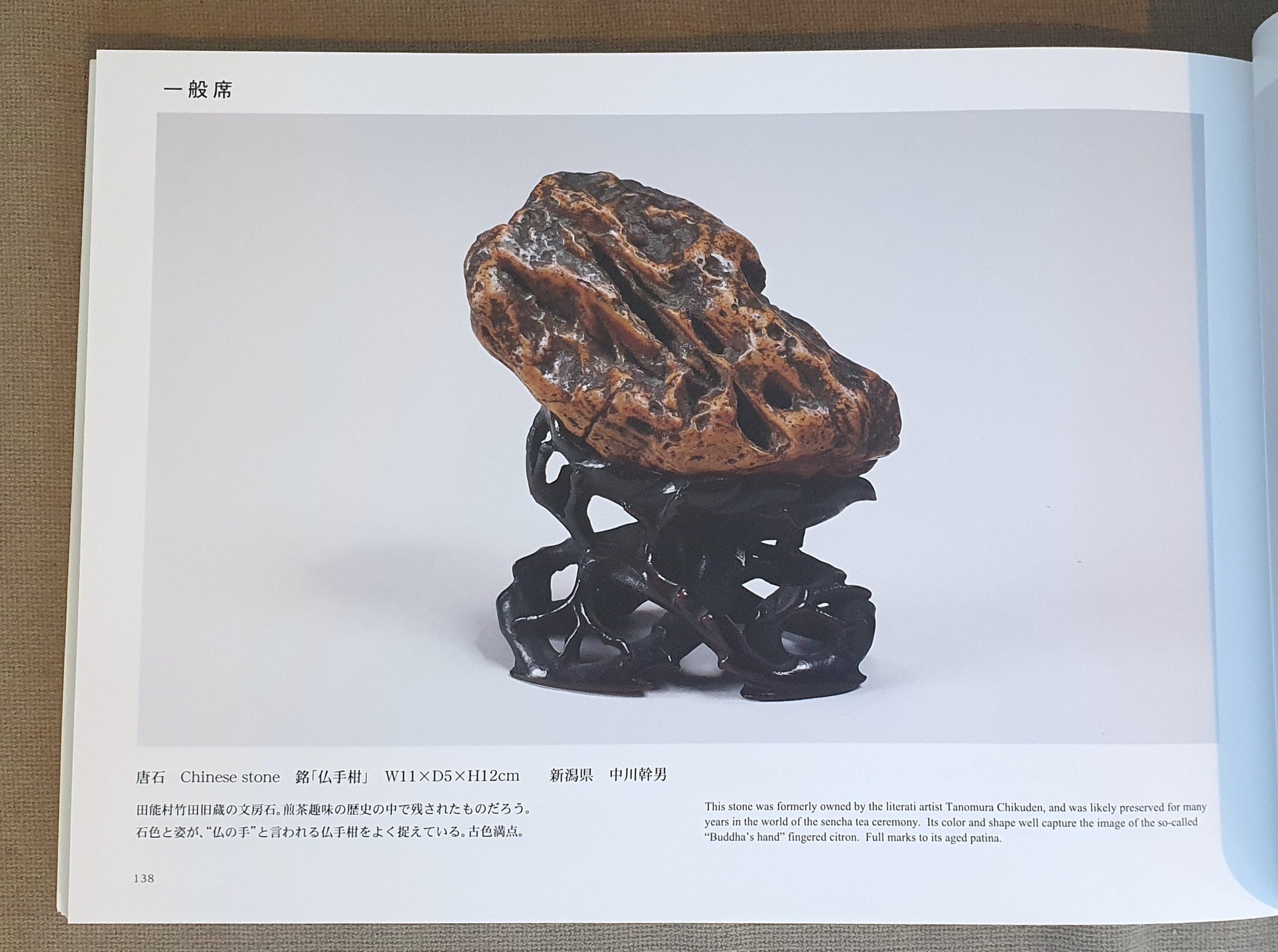 After re-visiting my suiseki books, I found in the 9th National Japanese Suiseki Exhibition catalogue what I'd been looking for. On page 138, there is a very similar stone, albeit with a different style of daiza. In that book, the stone is described as "Chinese Stone", formerly owned by Tanomura Takeda, and similar to this one, described as "Buddhas Hand".