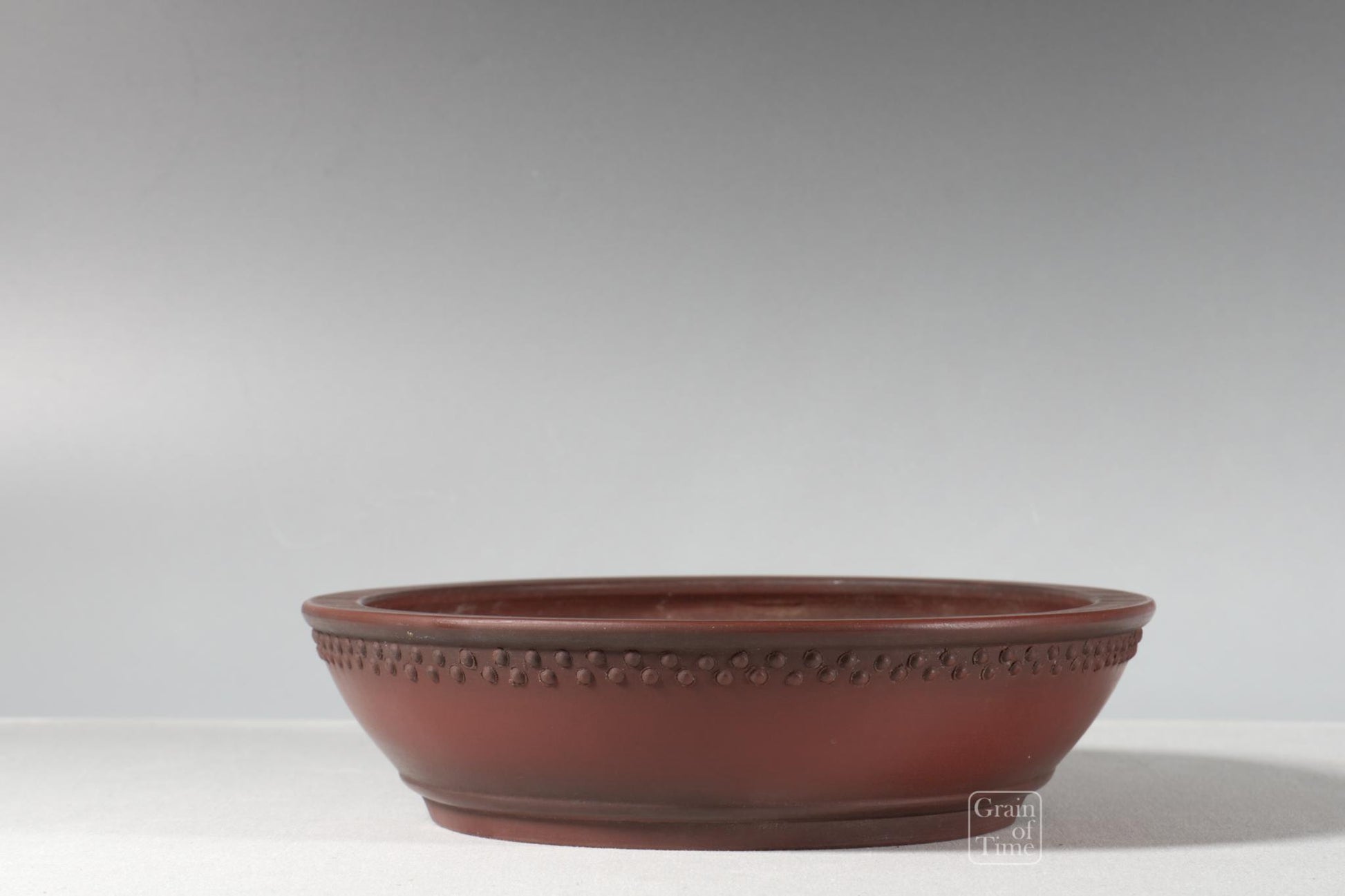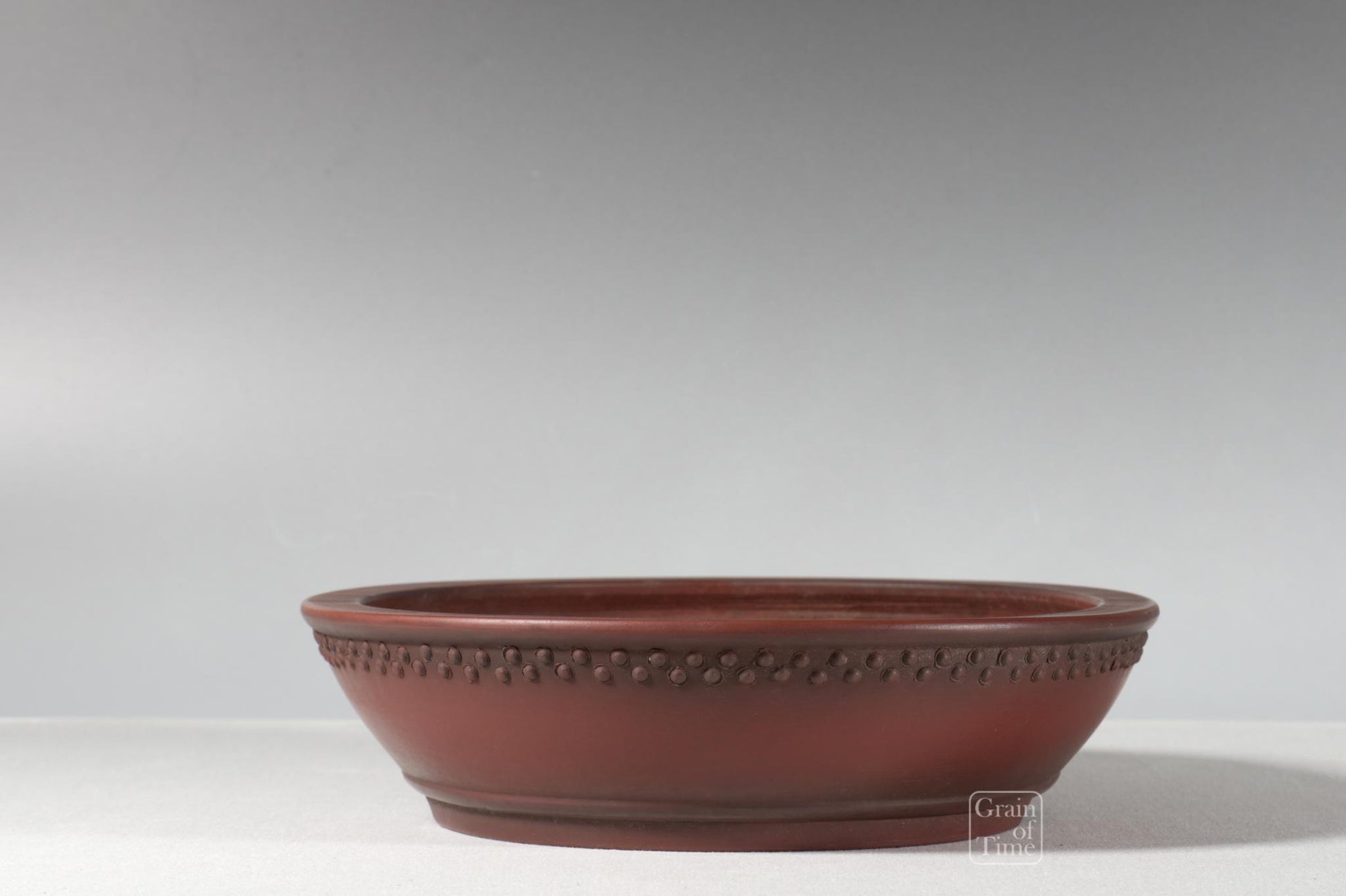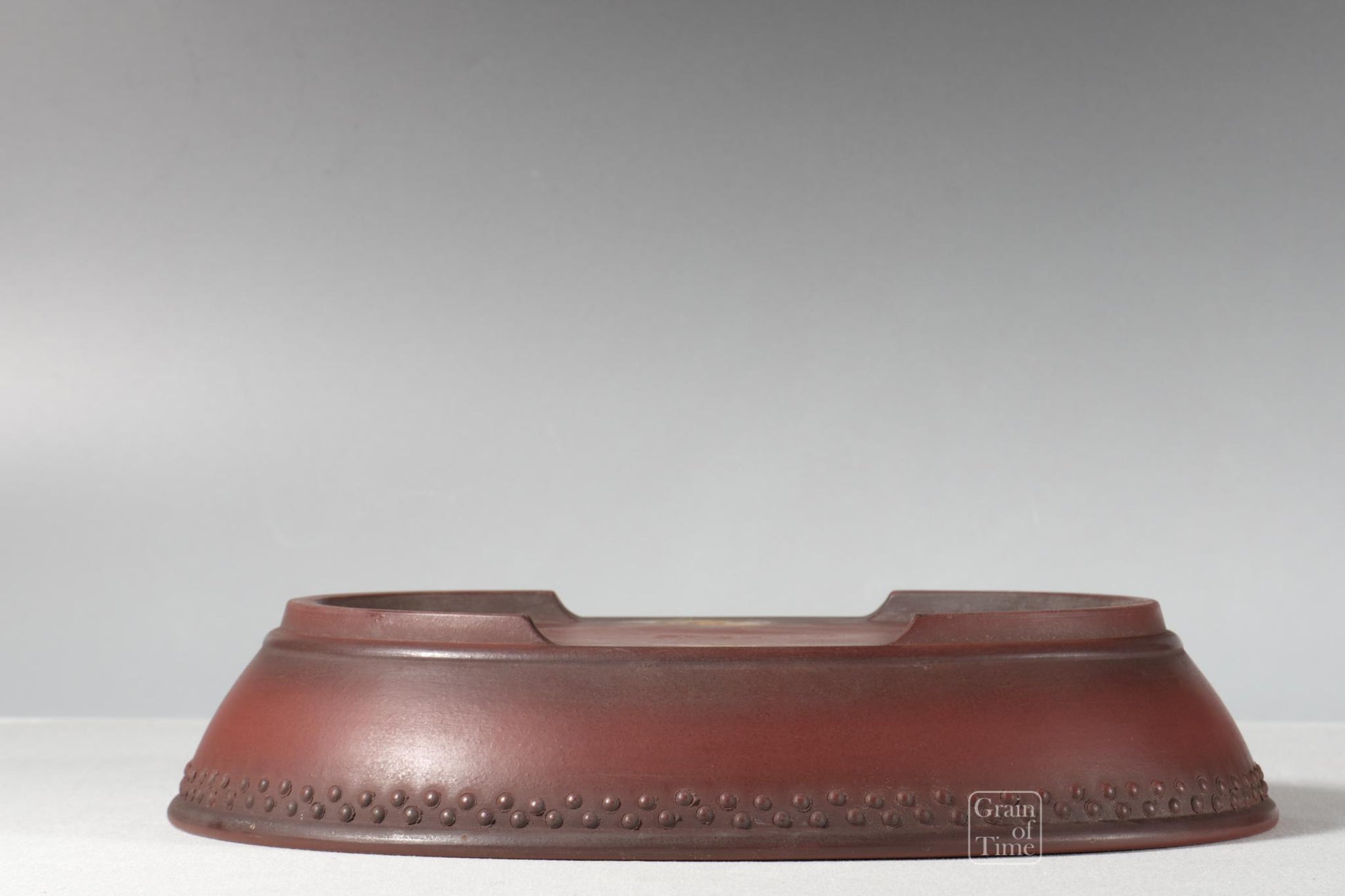 Japanese bonsai pot from the Bigei kiln of Tokoname. Oval with slight internal rim, top band of studs, lower band, cut feet with nail signature of Bigei underneath.