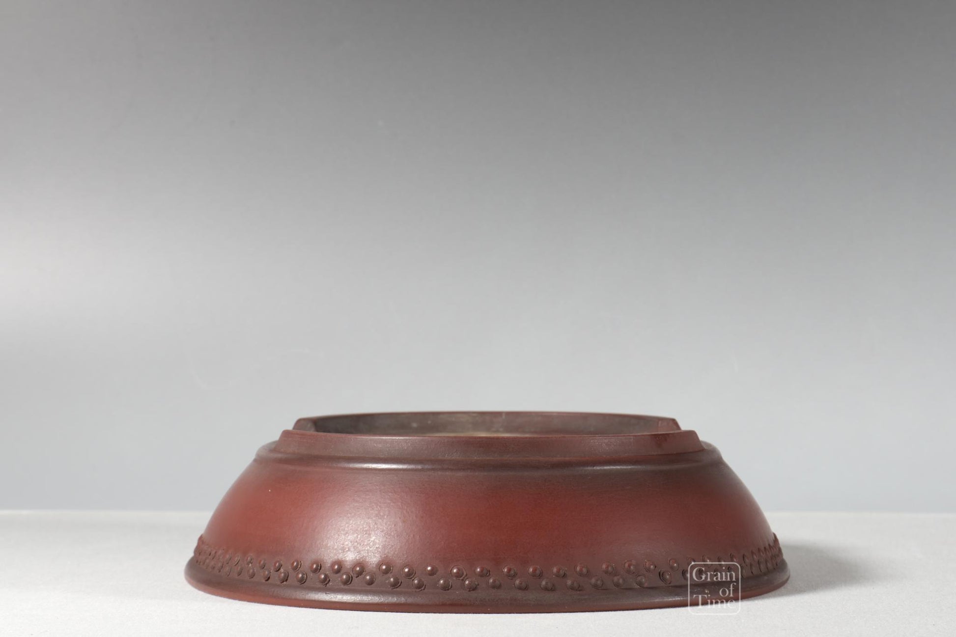 Mould made, hand finished, a large pot, in a rare design from Bigei with his burnished, antique Chinese looking red clay. Ideal for Junipers and other trees with red notes to their bark, but given the shape and style this could also suit a number of refined deciduous trees. A great piece, understated, unusual with unmistakable Bigei style.