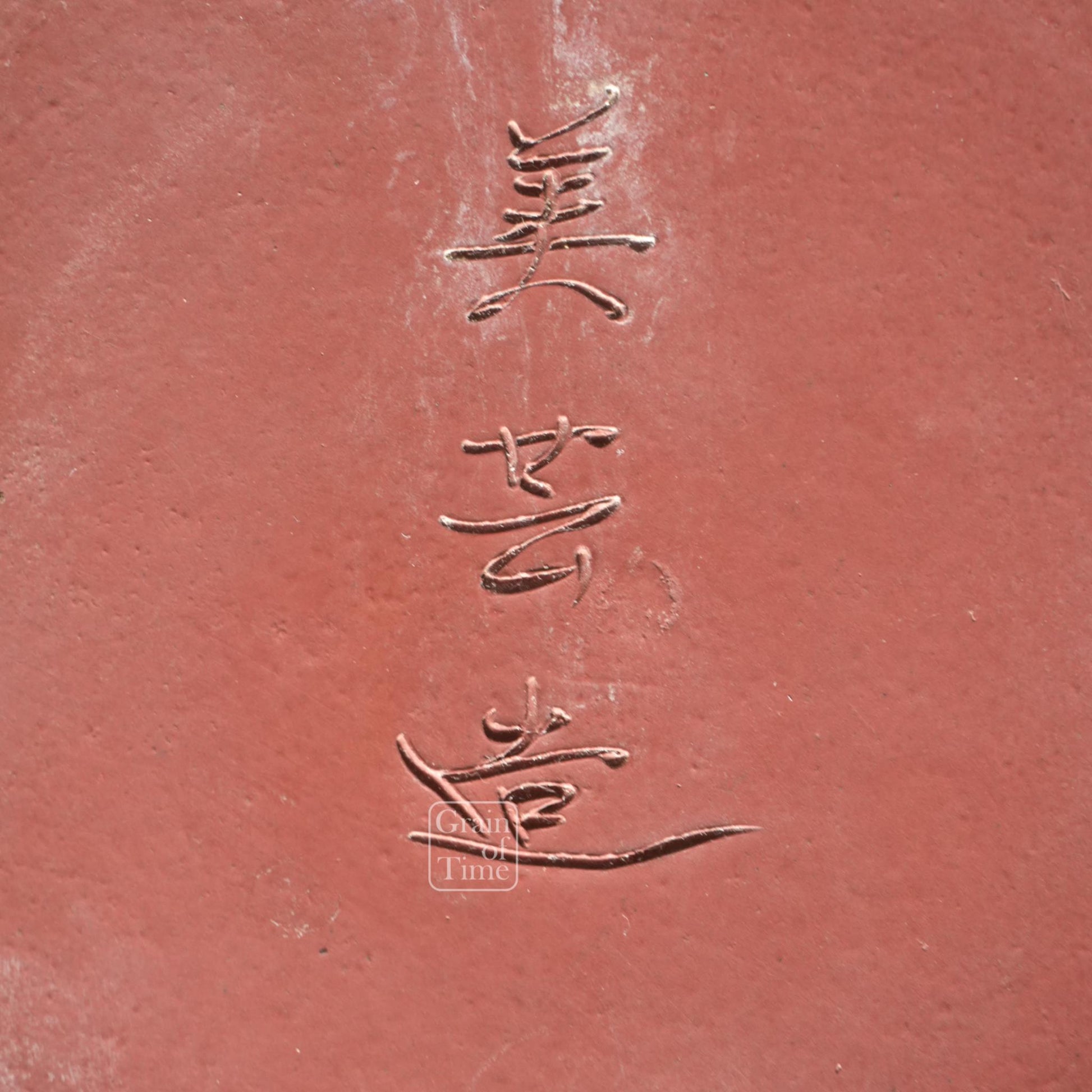 Bigei, real name Hirata Ryomi - born 1935, started pottery in 1958 (aged 23), established his kiln Bigei (Beauty) in 1975 (aged 40), producing his immediately recognisable and popular bonsai pots. He produced highly burnished vermillion pots with a great lustre, also glazed work, nail carved drawings and under the Sansui name, painted pots.