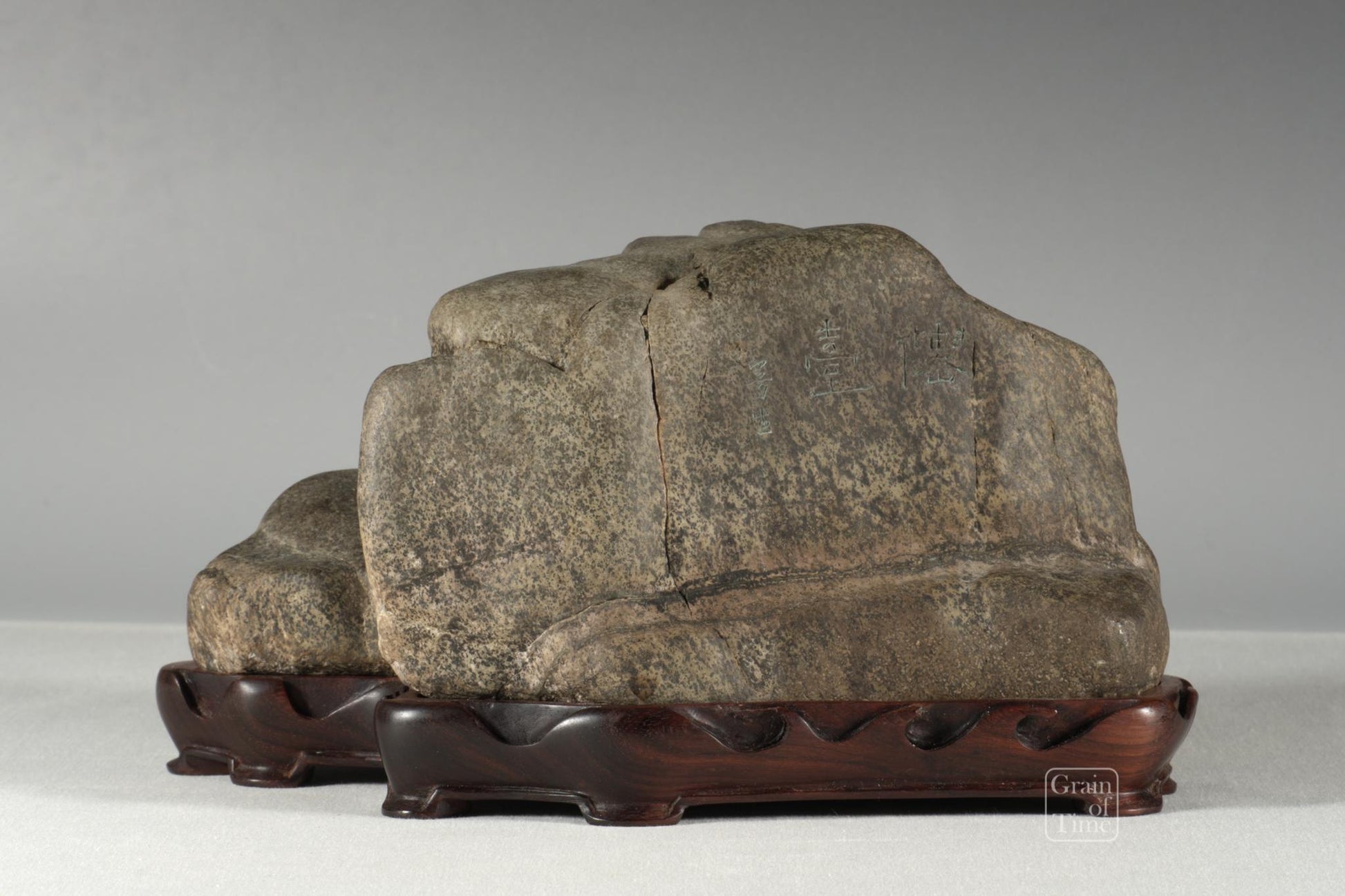 The thing that gives this away as a Chinese stone is the engraving on the back. It reads (something like) "Composed by Daishan Kisho". Engraving on viewing stones is almost an entirely Chinese phenomenon, and depending on the engraver, it can be quite a significant find.