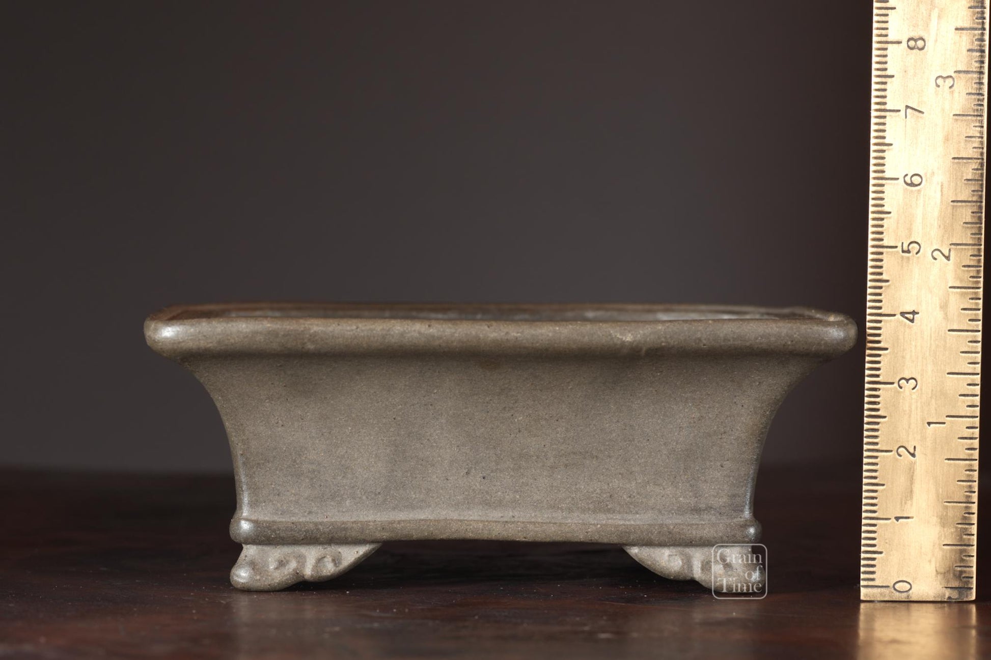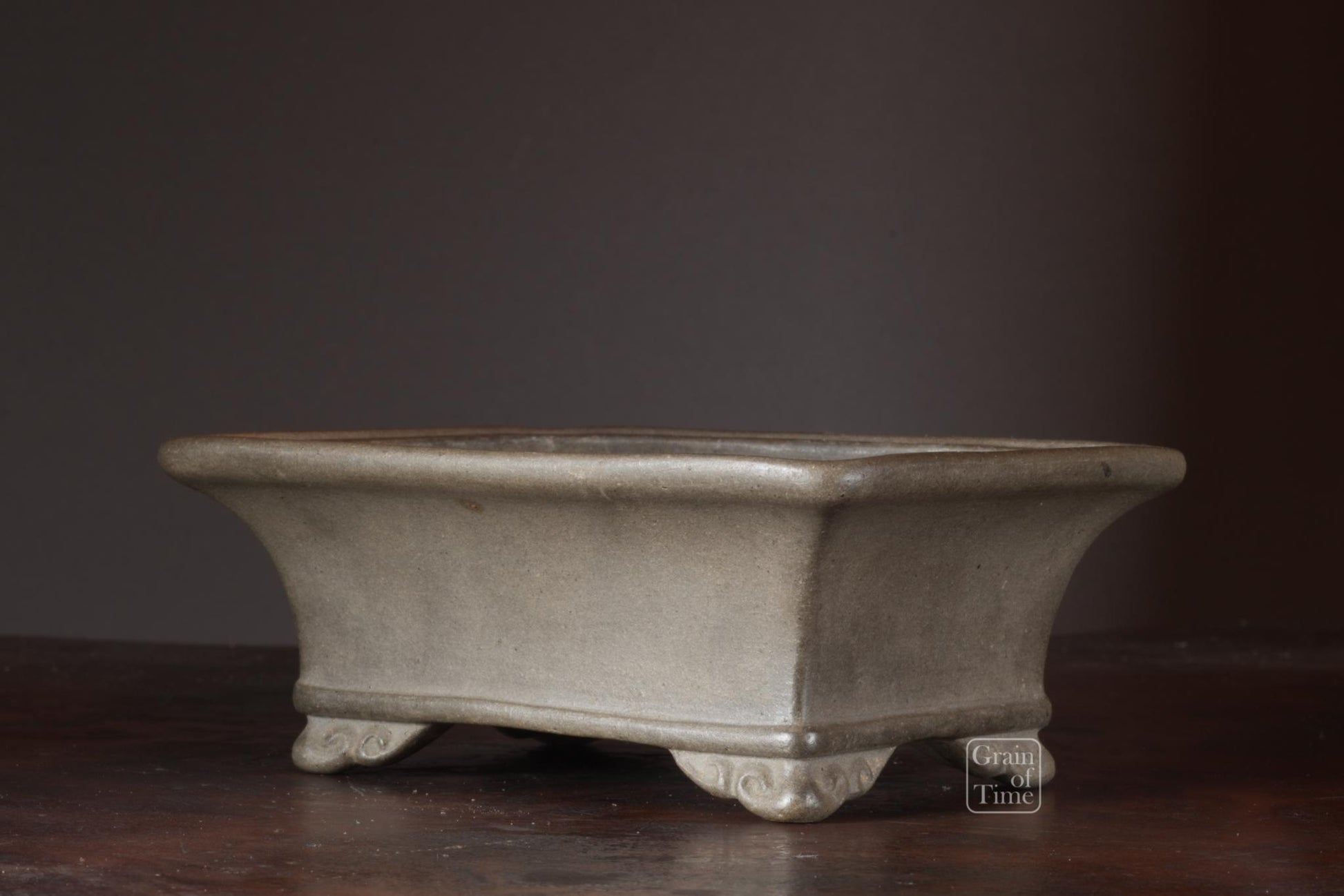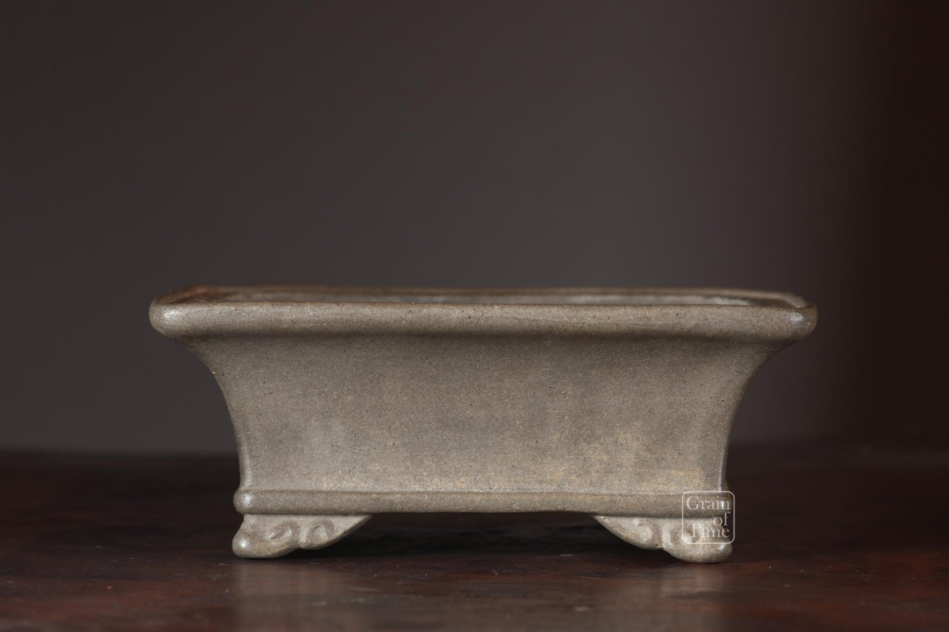 Artisan made Japanese bonsai pot from the Hokido kiln of Tokoname. Rectangle with external rim, lower band, cut feet and seal of Hokido underneath.