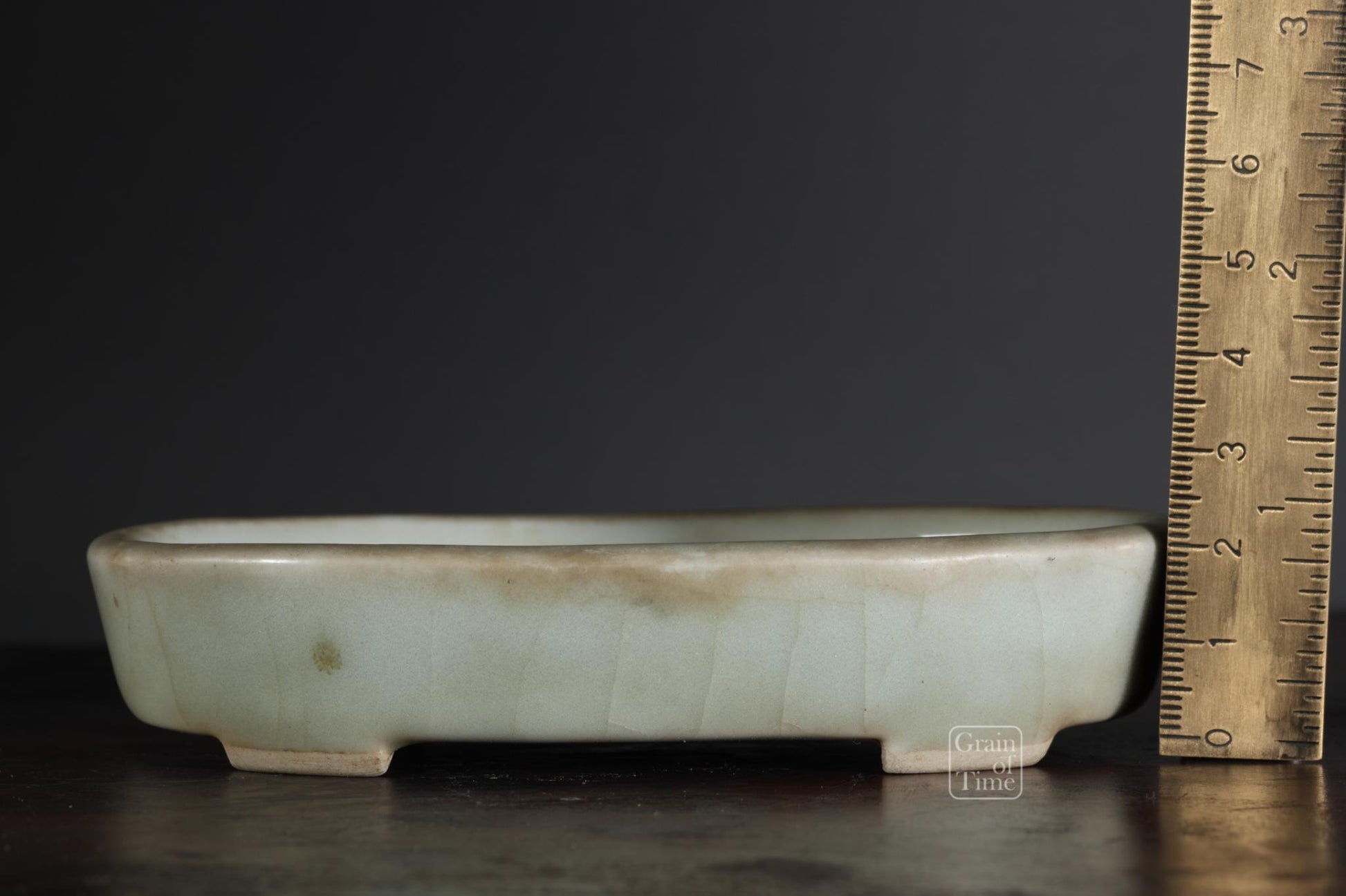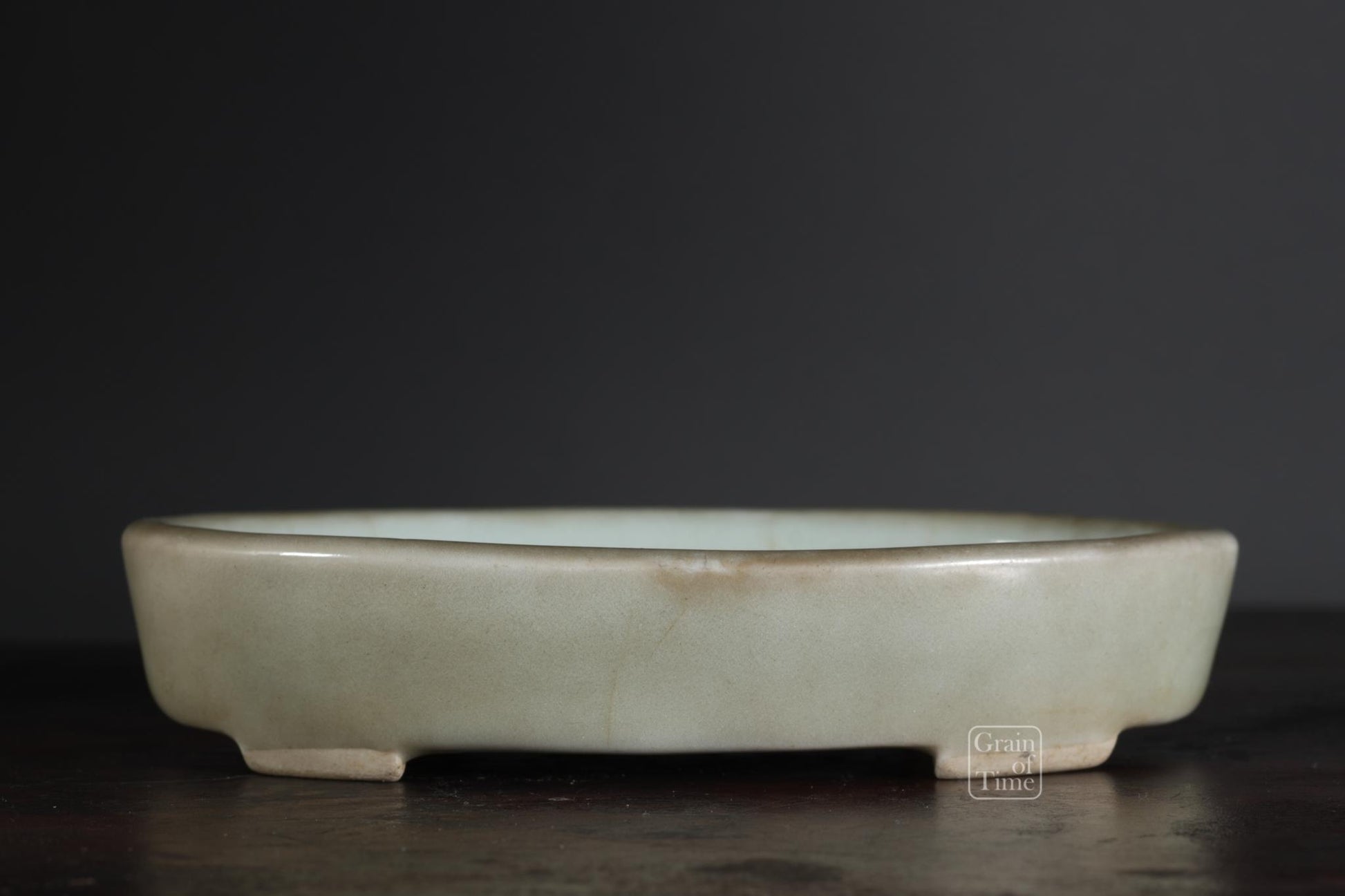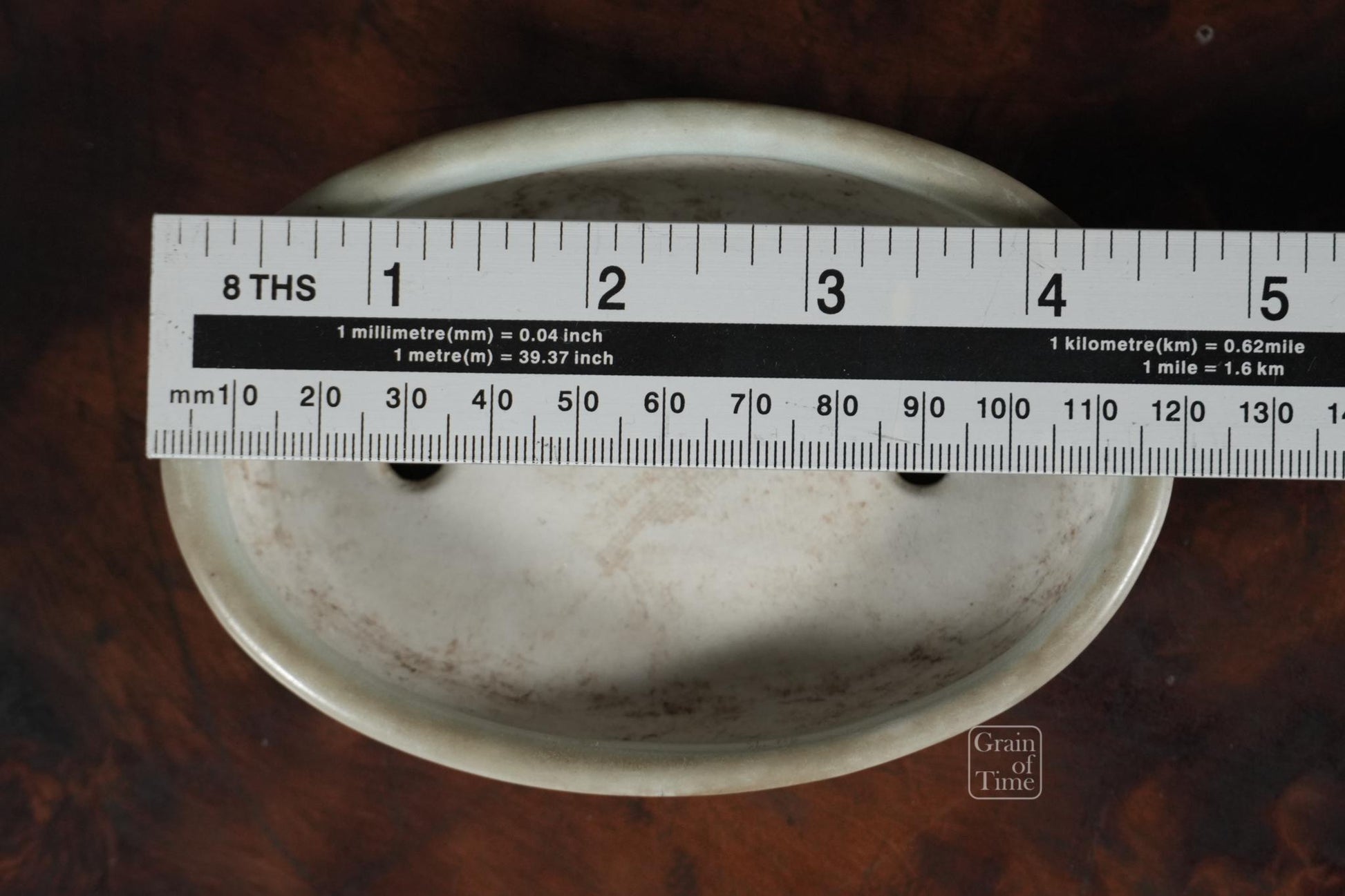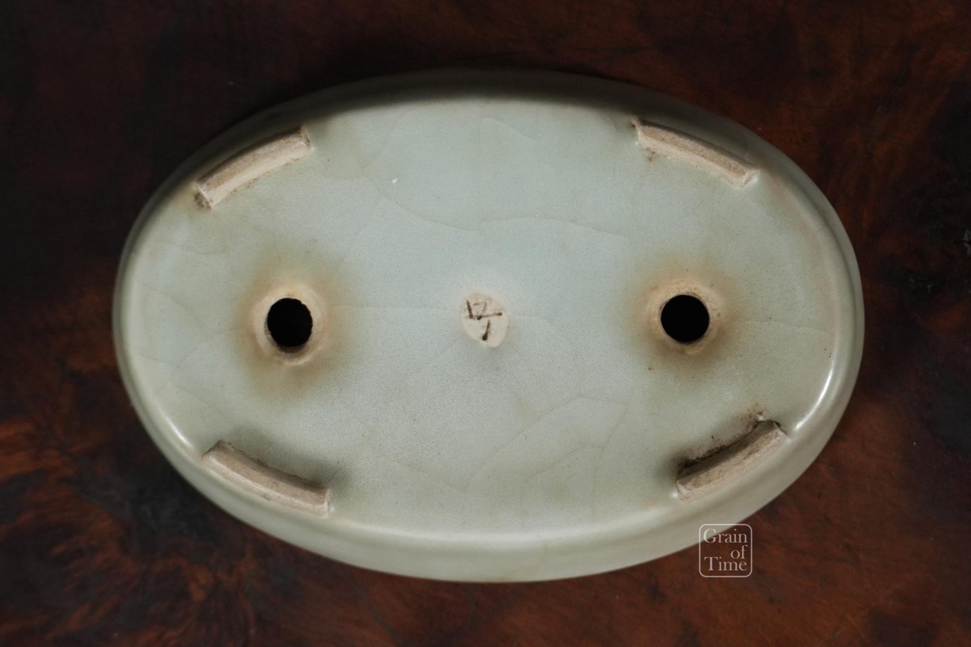 Handmade bonsai pot by Imaoka Machinao. Oval with no rim, cut feet, blue Celadon glaze over, nail signature of Imaoka Machinao underneath.