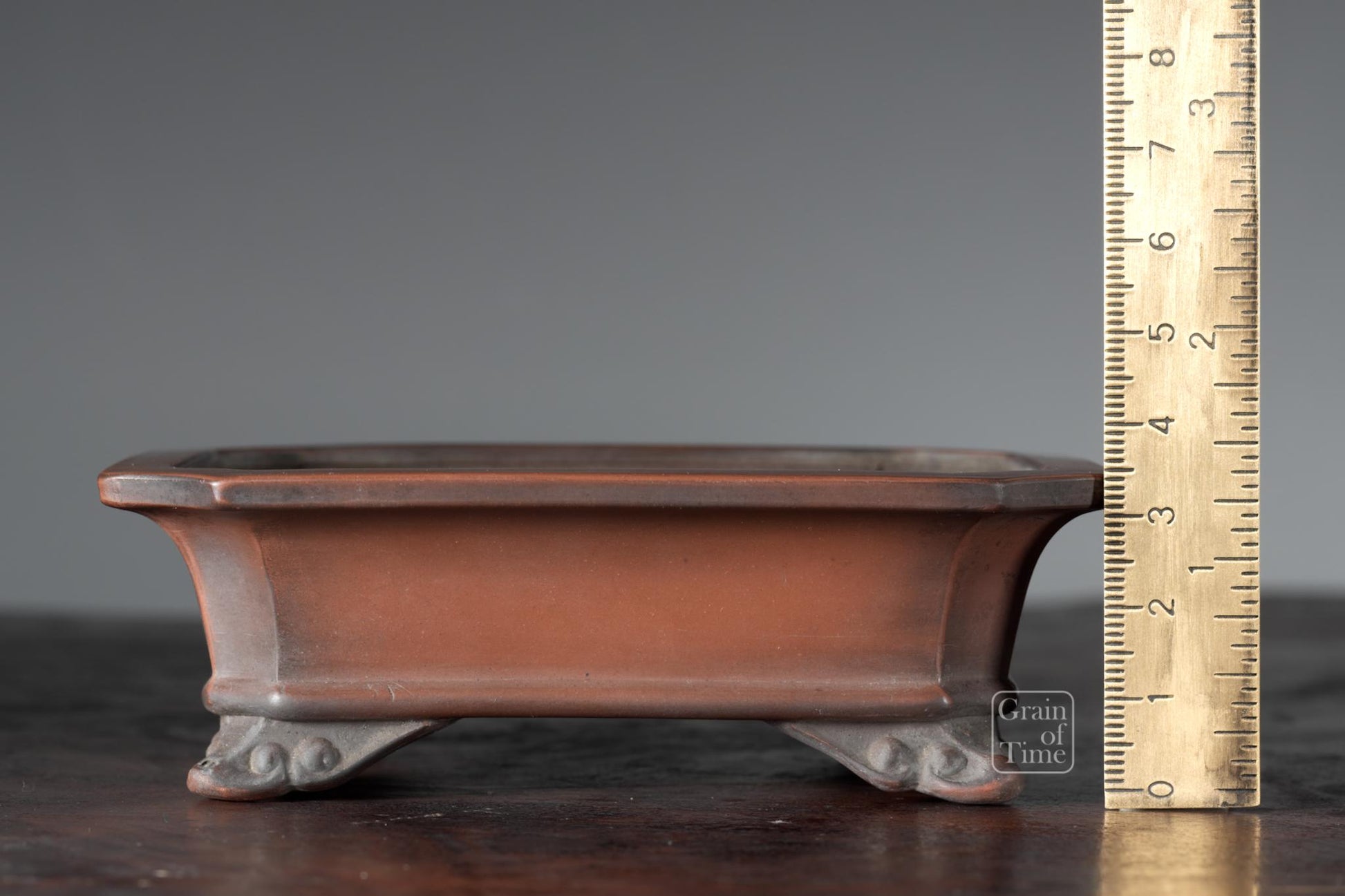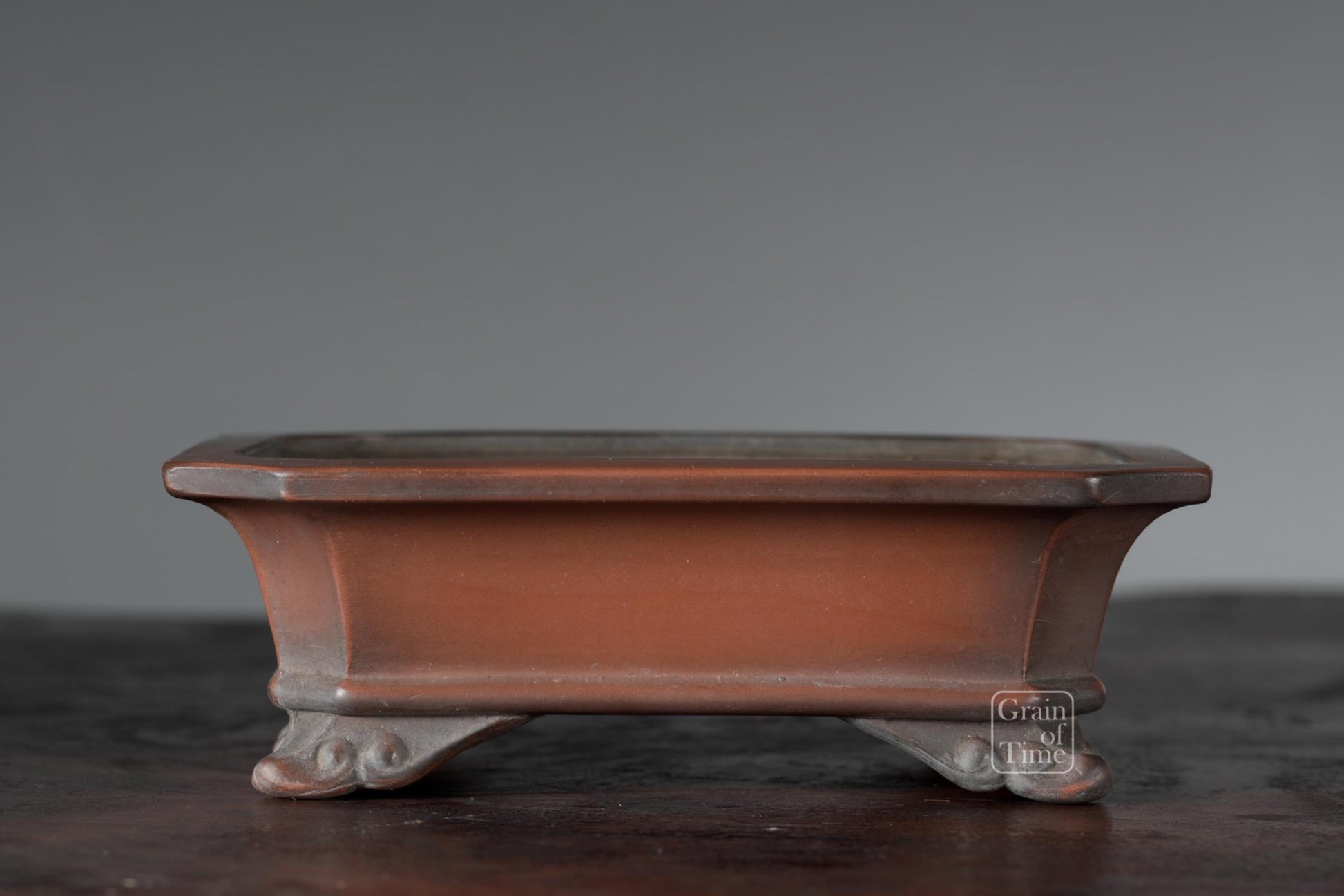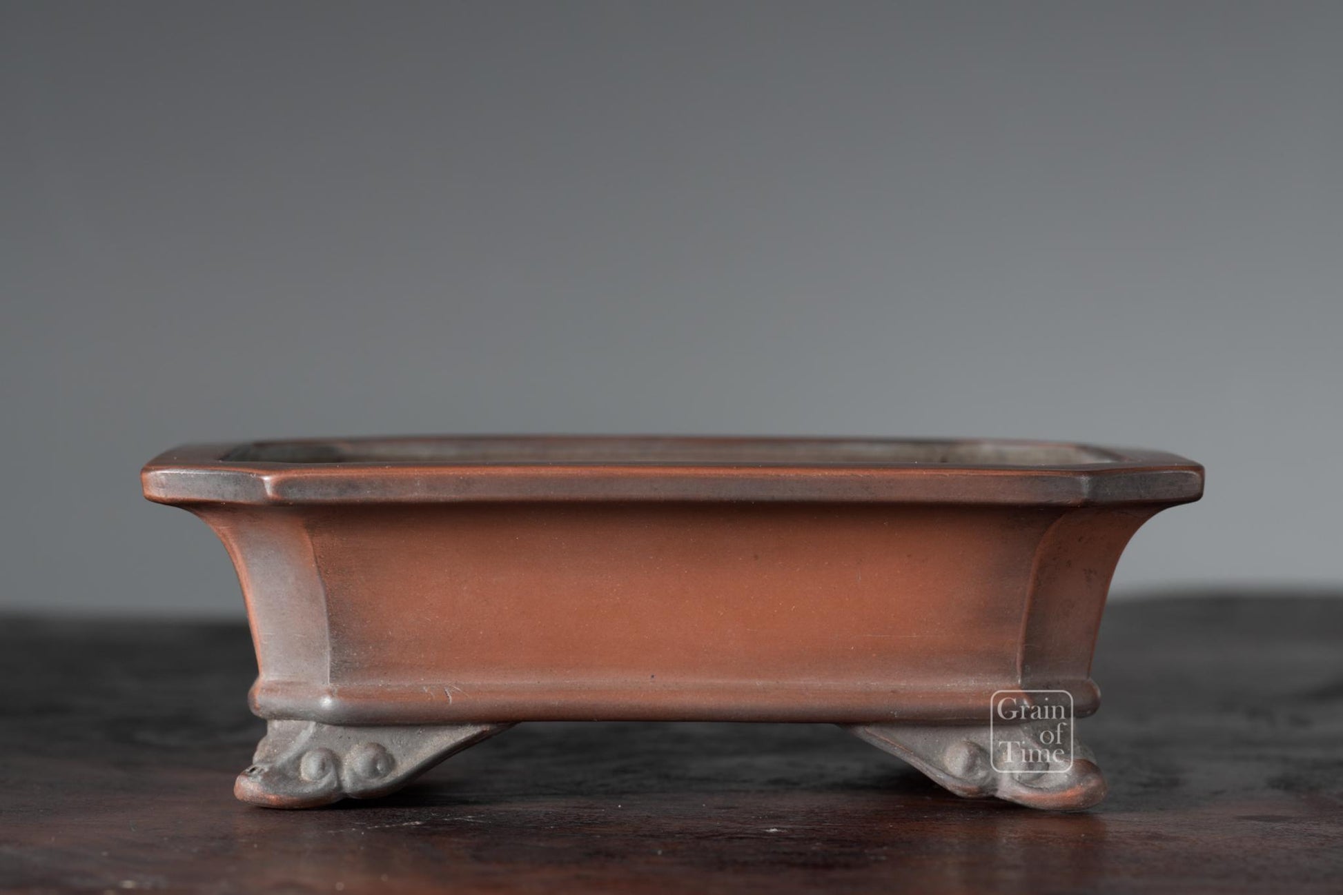 Artisan made Japanese bonsai pot from the Hokido kiln of Tokoname. Rectangle with external rim, lower band, cut feet and seal of Hokido underneath.