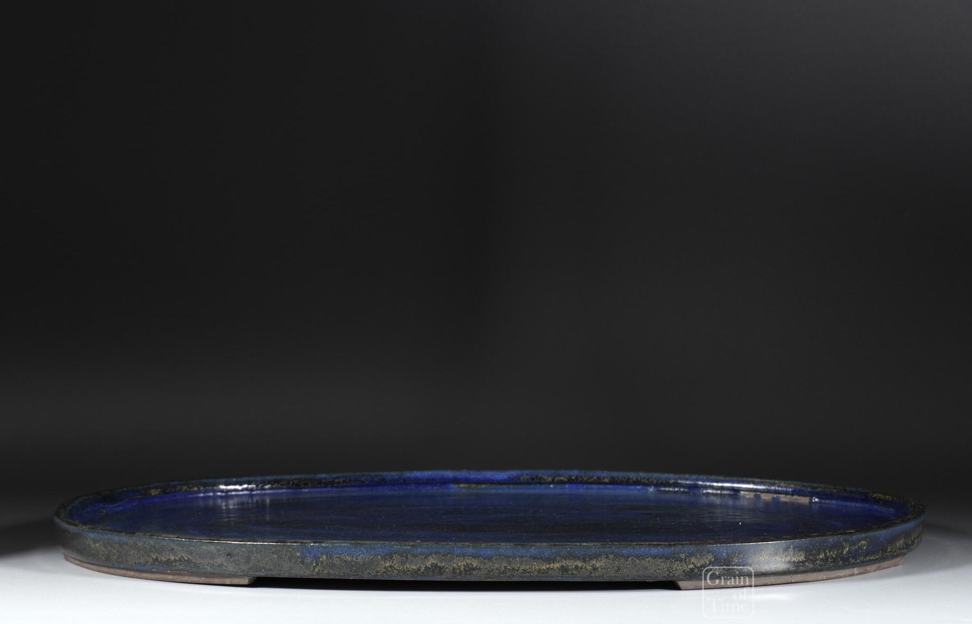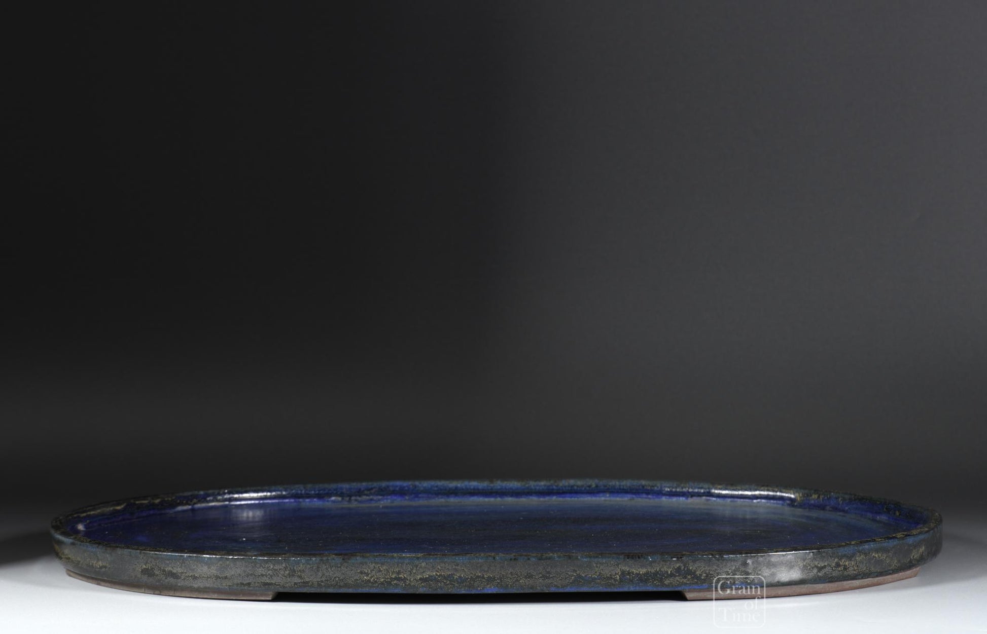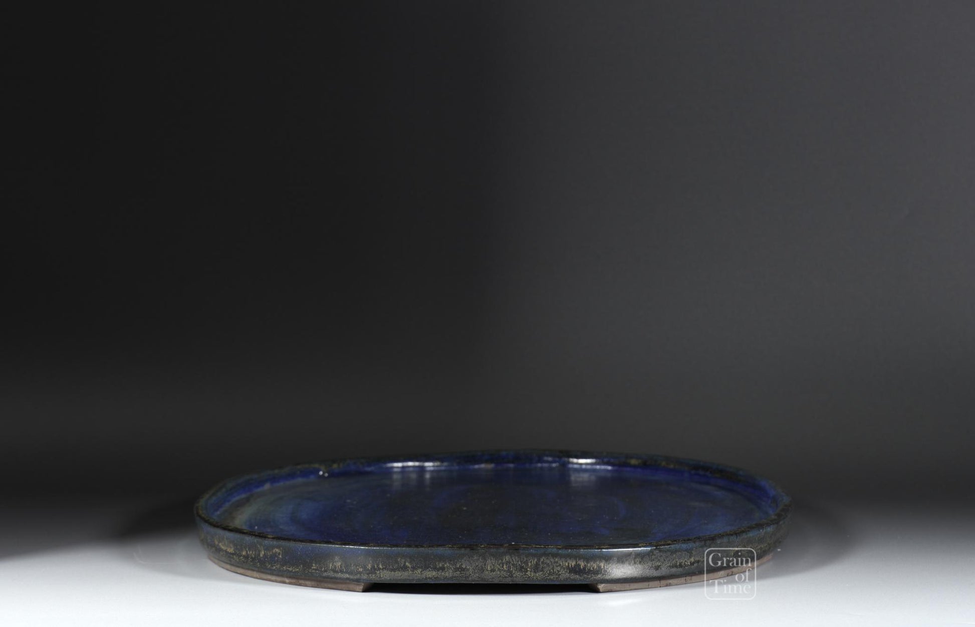 Oval Suiban from the Tosui kiln. Oval with no rim, cut feet, Ruri blue & gold glaze over, seal of Tosui underneath.