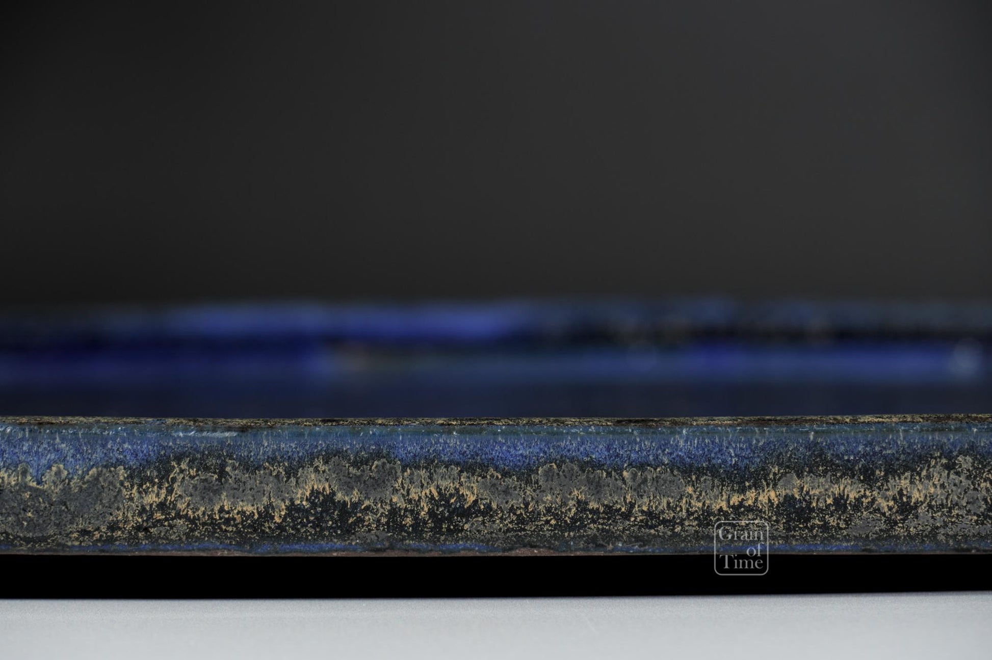 The glaze is a traditional dark Ruri blue with a second glaze layered over the top, creating a subtle gold and blue landscape. The very shallow feet are also in a very pleasing ratio to the width of the pot.