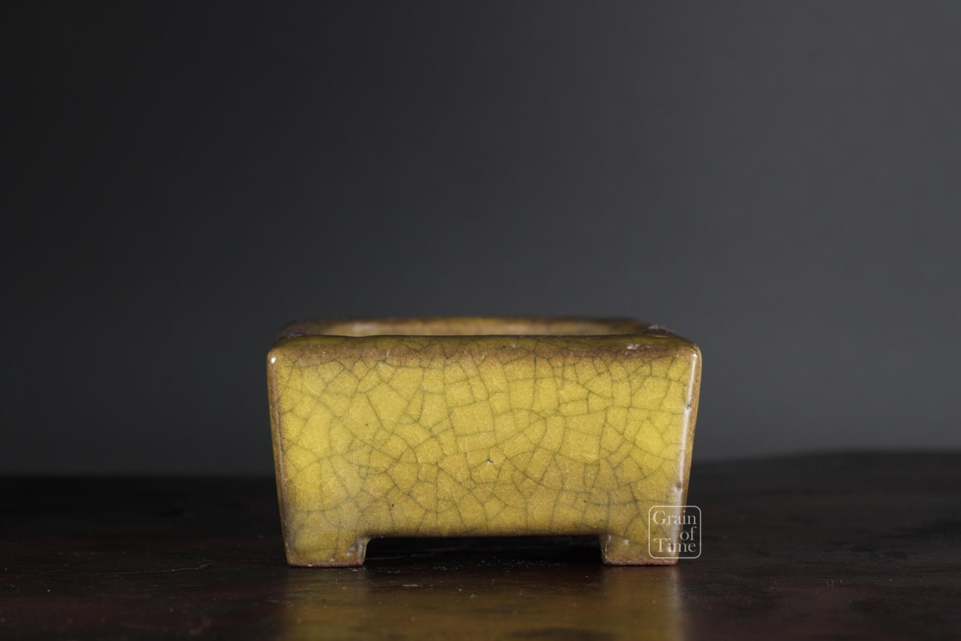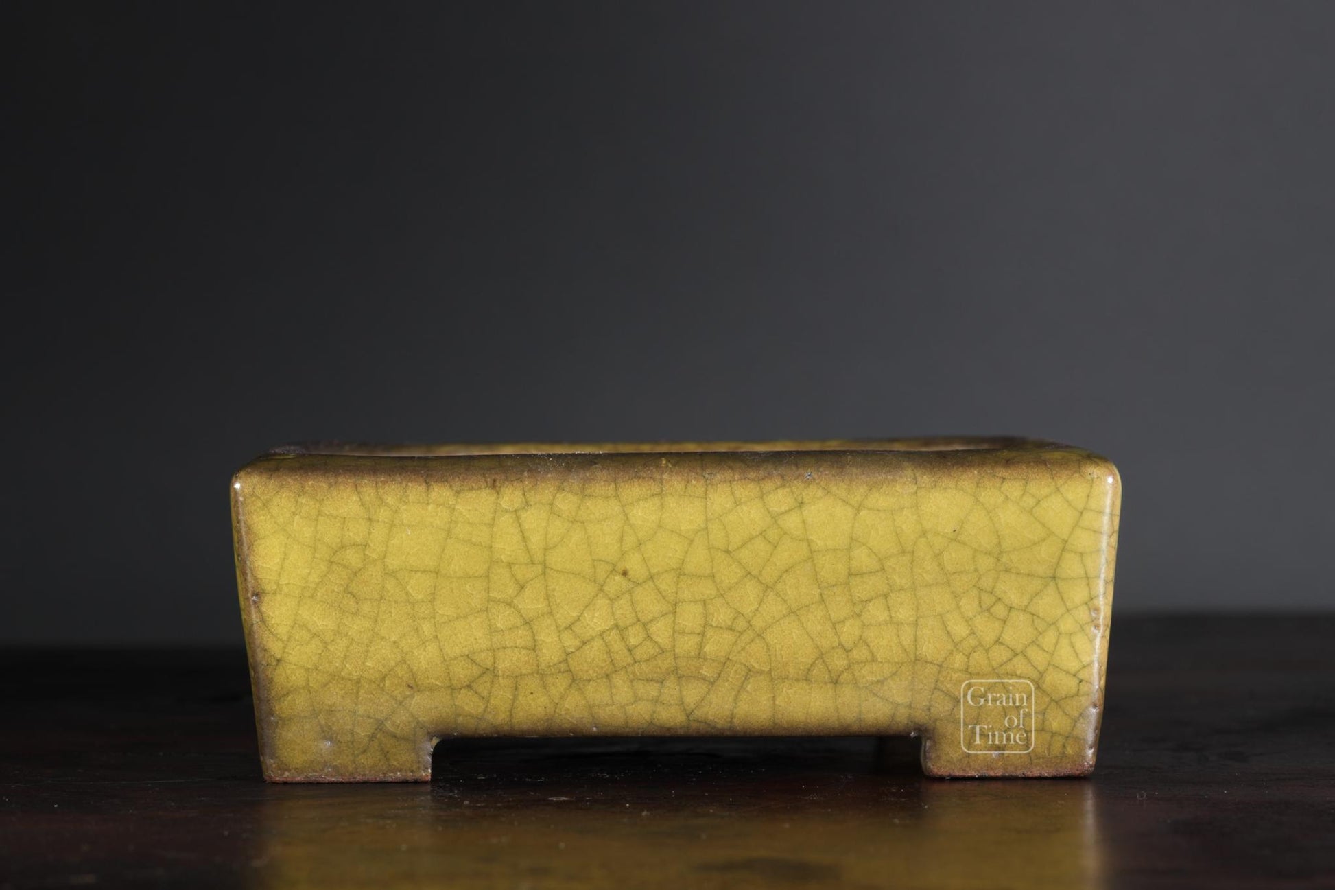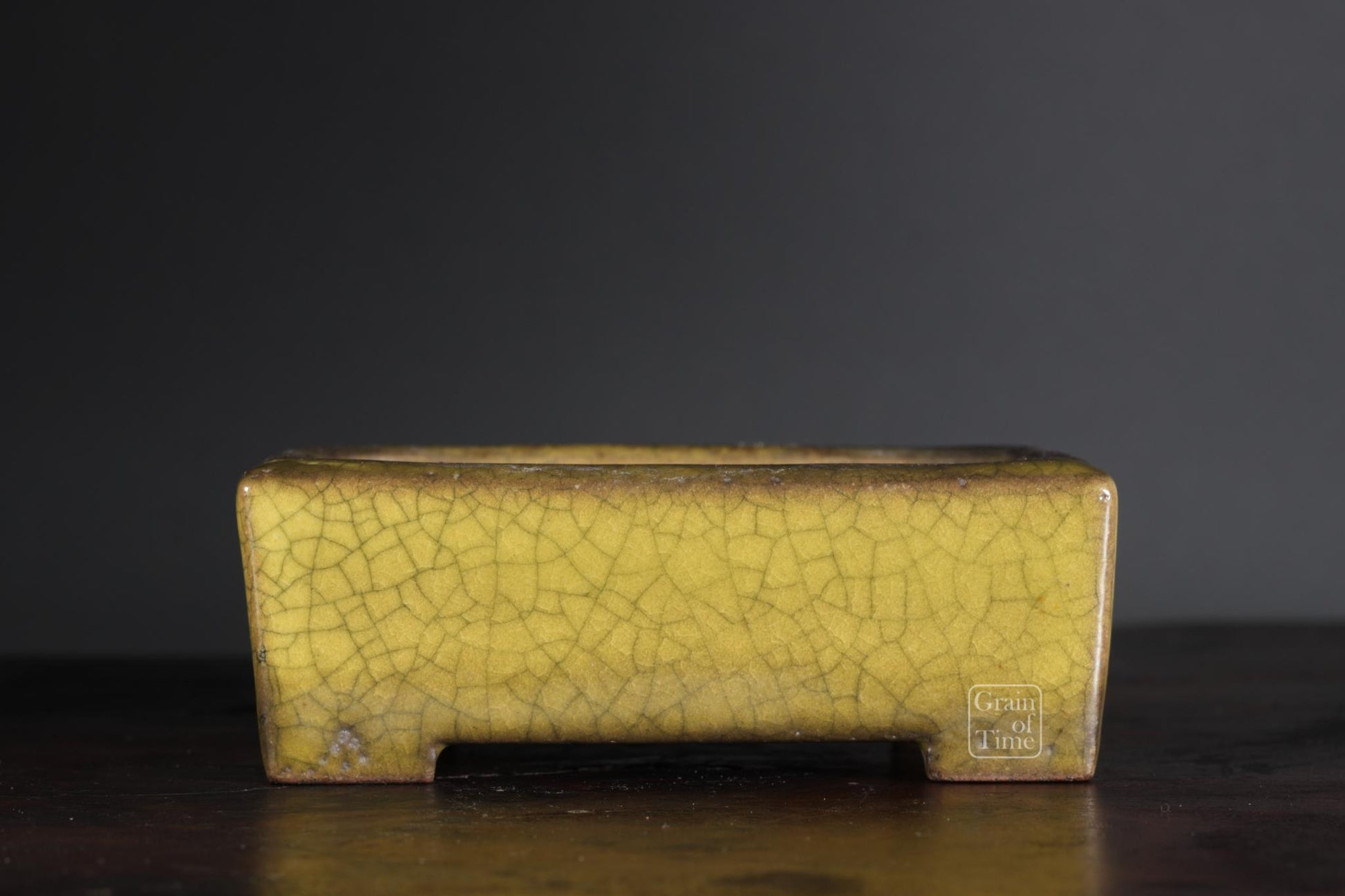 Gyoun's classic yellow crackle glaze, this time on a very practical rectangle, and with a perfect patina that mellows the whole pot. Just a lovely thing, no excess ornamentation, simply a well made pot and plenty of time.