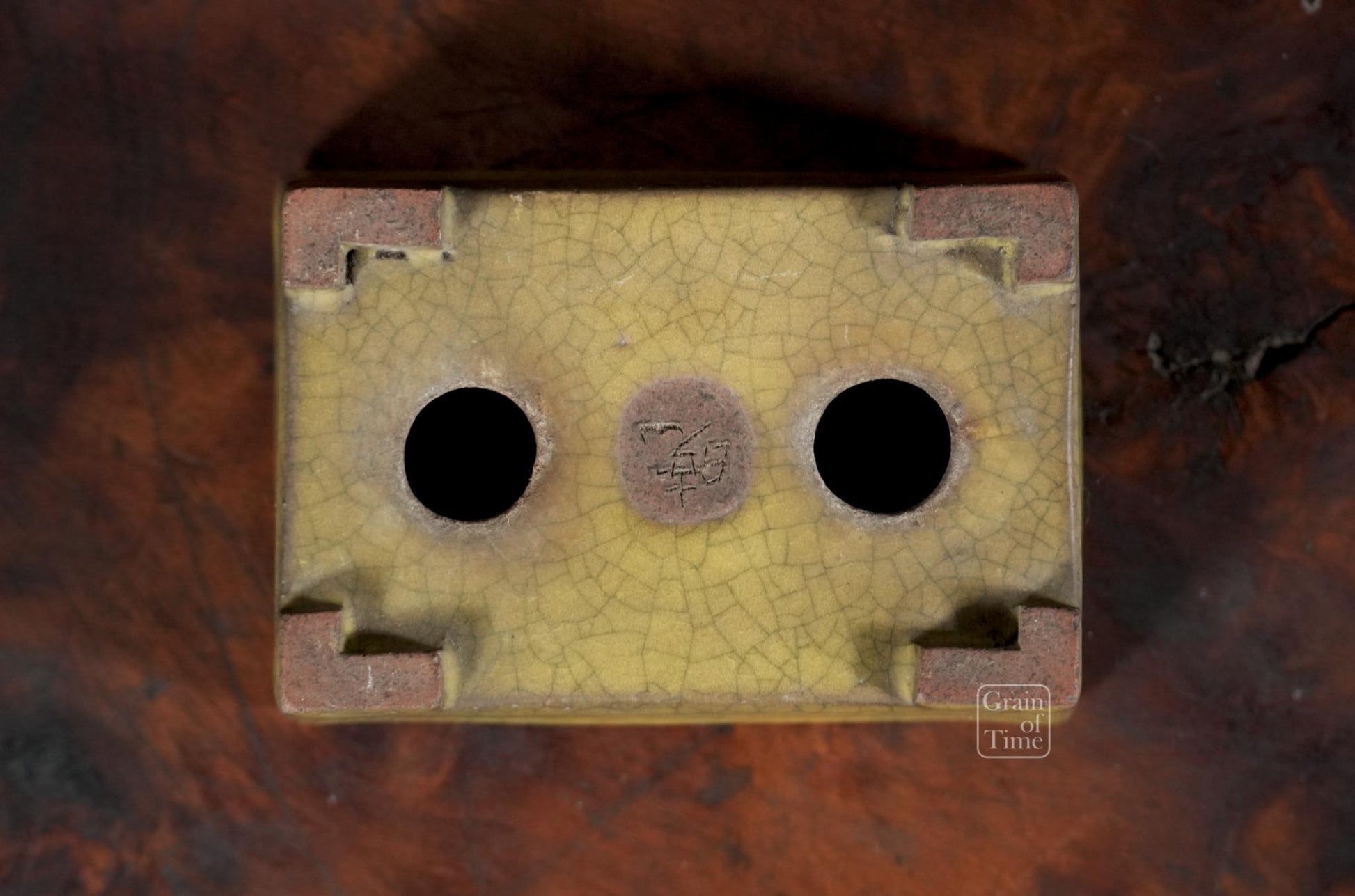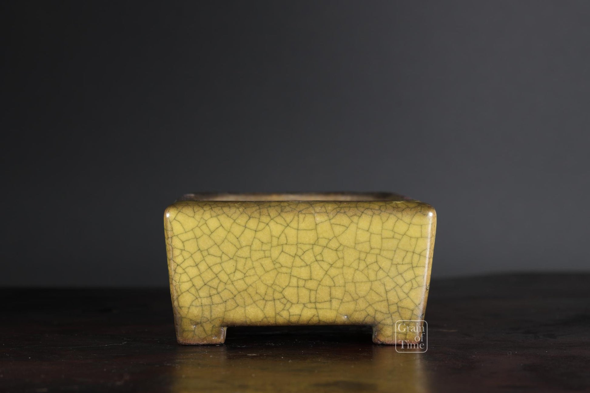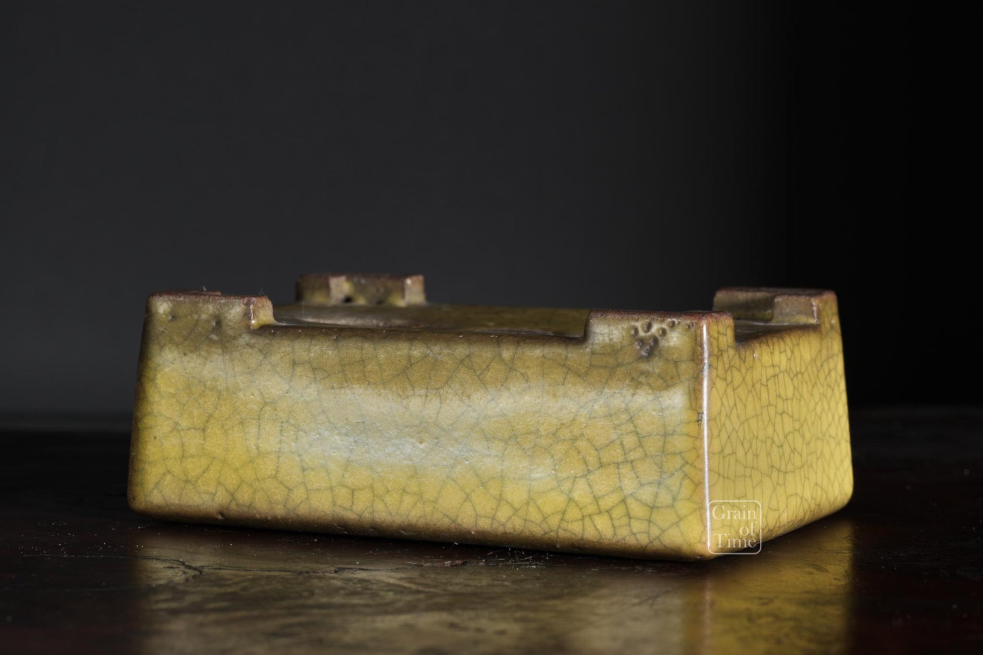 Gyoun's classic yellow crackle glaze, this time on a very practical rectangle, and with a perfect patina that mellows the whole pot. Just a lovely thing, no excess ornamentation, simply a well made pot and plenty of time.